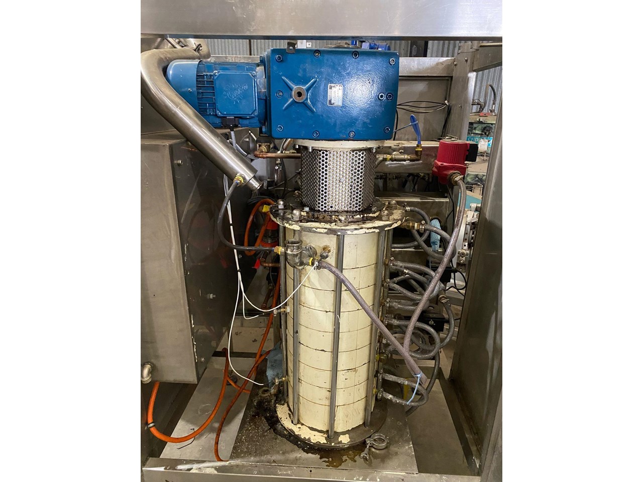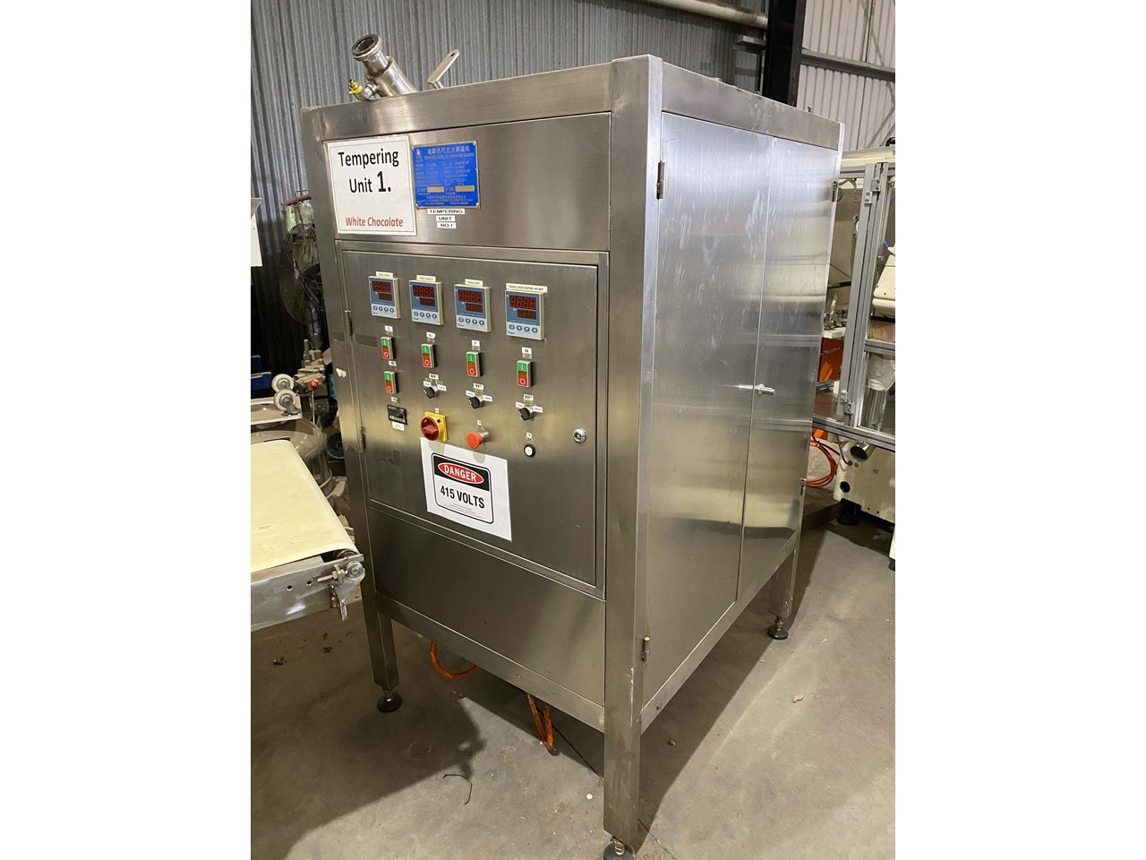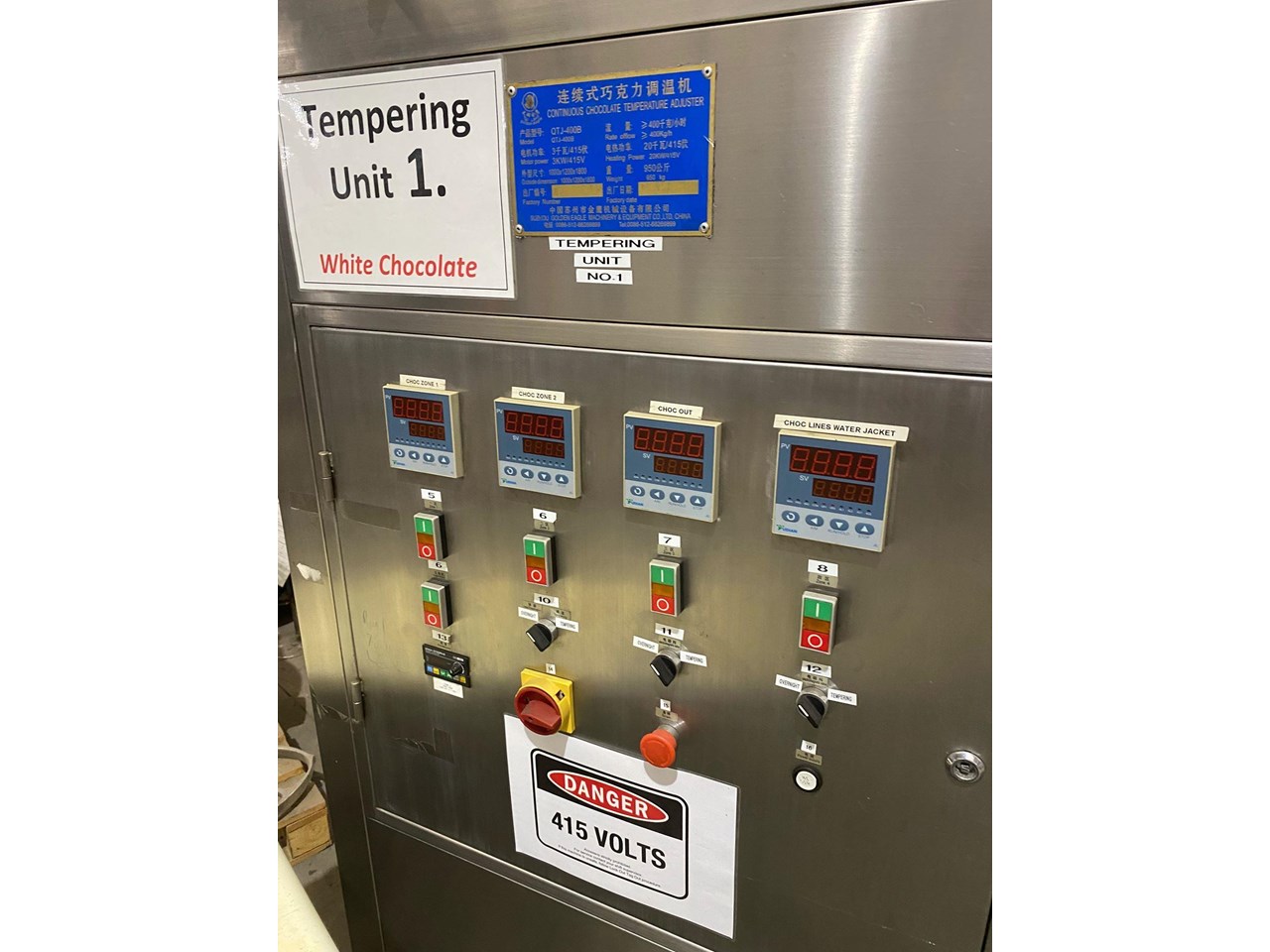 SUZHOU Golden Eagle 400kg/hr Chocolate Tempering Machine. Year 2007 Drive Motor Nord 3kw 415v Heating Power 20kw 415v Overall dims 1000 x 1200 x 1800mm high Weight 950kg Good Condition.