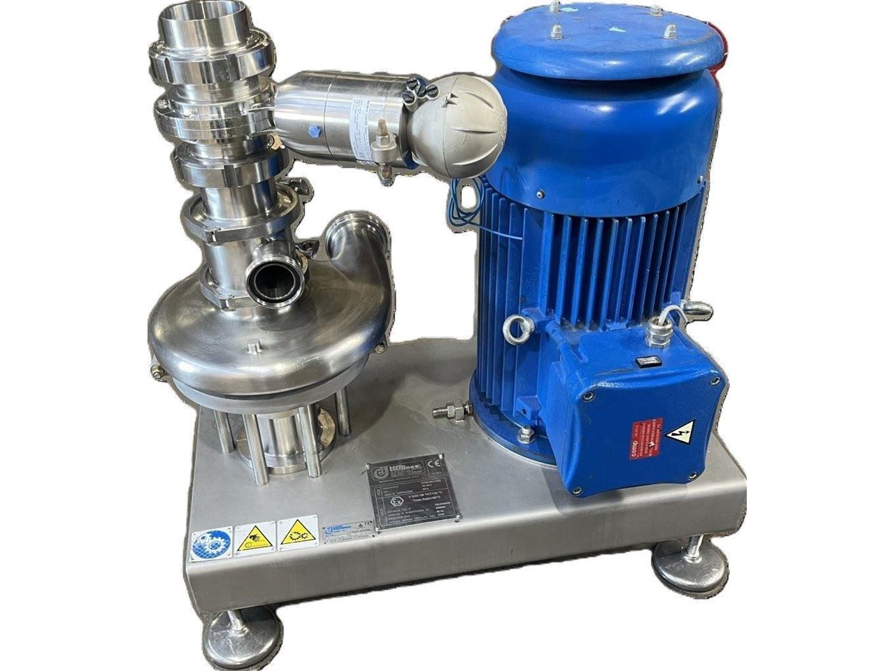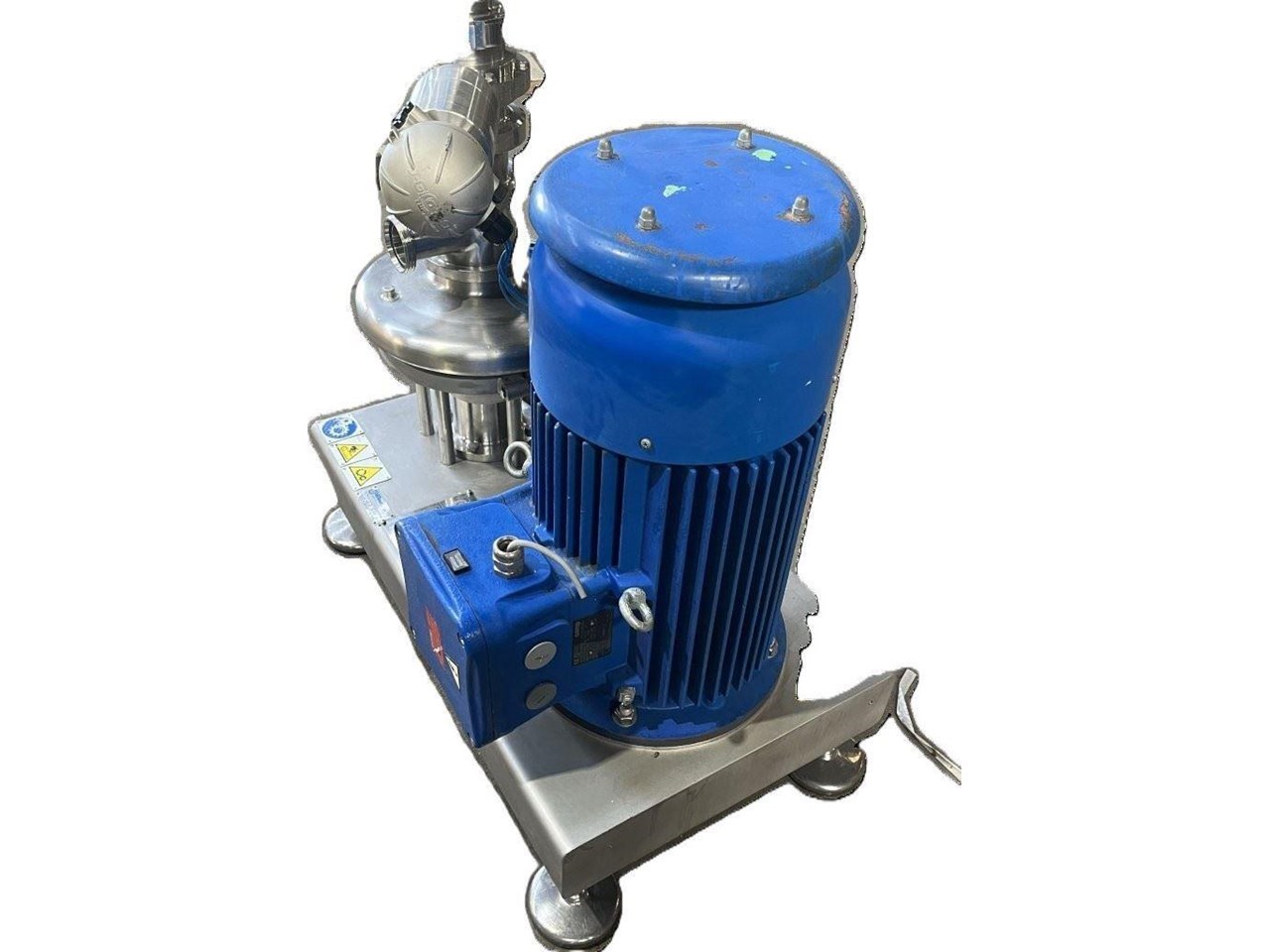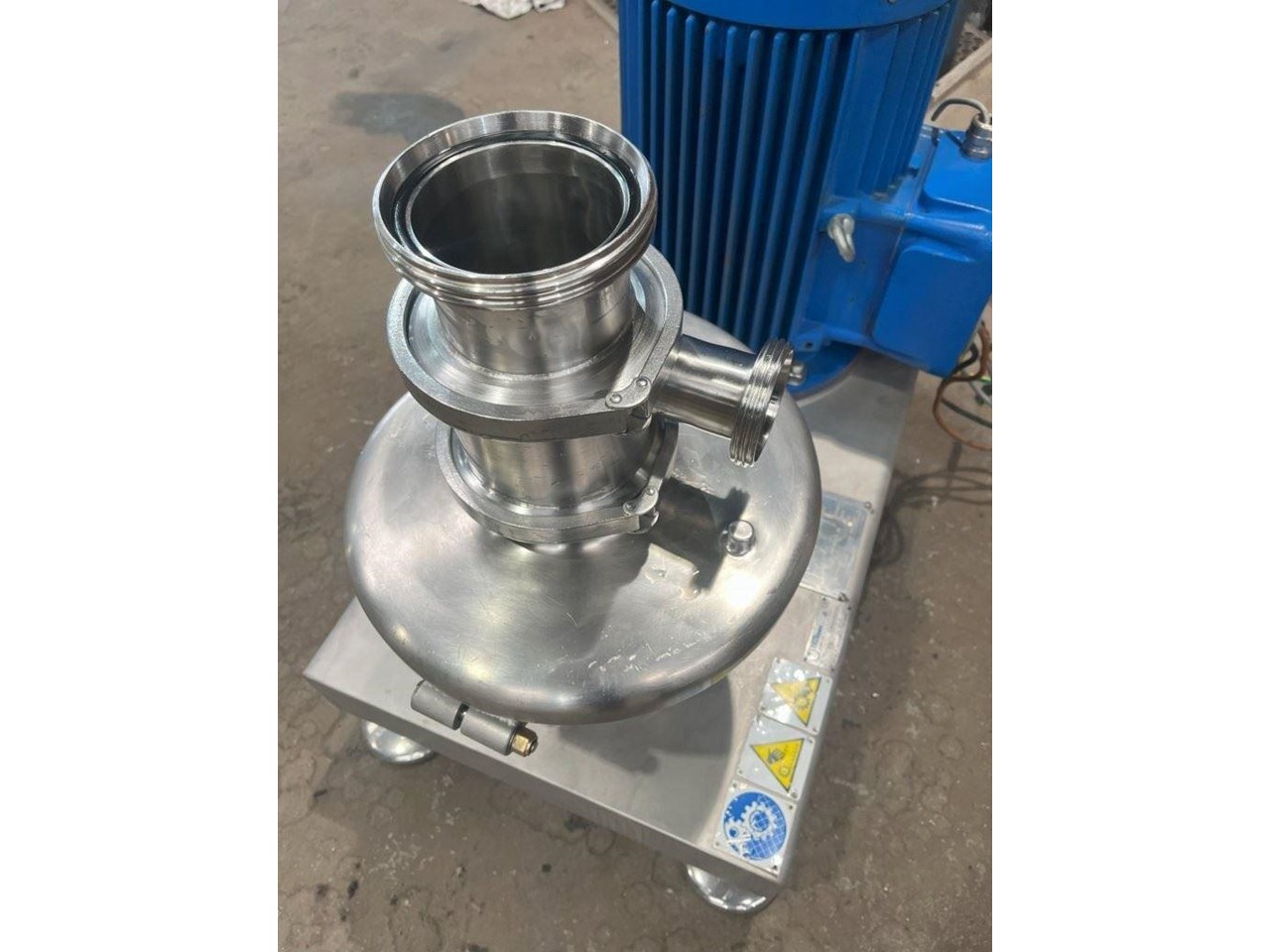 TECNINOX - Tri-Blender ATEX Rated Powder/liquid blending system. Fast, thorough and trouble-free blending. Tri-Blenders make it easier than ever to mix powders with liquids, and avoid the time, trouble and lost product associated with reprocessing and pre- and post-blending operations. The Tecninox Tri-Blender is specially designed to thoroughly and efficiently blend powders and liquids, while minimising the air introduced into the process. That means the lumping, foaming and flooding associated with conventional mixing equipment is almost totally eliminated. Unique Tube-in Tube Design. The Tri-Blender is designed to be installed close to the Vessel outlet and at floor level. That's why companies from every process industry are turning to the Tri-Blender to streamline blending applications. The Tri-Blender is designed to integrate easily into your present process system. Plus, its compact size and easy portability means it can be moved or installed virtually any place in the process. Operation Principles. Dry ingredients are fed into the hopper. Vacuum created by the impeller draws the dry ingredients into the blending chamber. As the dry ingredients are added through the hopper, liquid is simultaneously pumped into the head of Tri-Blender. The diffuser tube separates powder from liquid until they are fed into the blending chamber. Applications: - Dairy - powdered milk, butter-milk, ice cream mix, whey protein - Food - pudding, chip dip, pizza sauce, stabilizer addition, powdered egg, starch and gum - Beverage - concentrate, flavor addition, vitamin drinks - Personal Care - soap blends,lotion, cosmetics, hair gel, tooth paste - Chemical - herbicide agent, film solution, fertilizer, biodiesel - Pharmaceutical - active ingredient blends, cough syrup, tablet coating Model Number: F4329-MD ATEX. ATEX Rating: II 2GD IIB T4/T135degreesC Tmax fluid=90C Dry Ingredient Capacity: 159 KG/MIN. Flow Rate: 34,000 L/H. Powder Inlet: 4 Inch Liquid Inlet: 2 Inch Liquid Outlet: 3 Inch Powder inlet has a pneumatic control valve. CEMP Electric motor, 3 Phase, 380/660V, 37.15/21.45A, 17.25kW, 60Hz, 1760RPM, EX rated Motor. Impeller speed approximately 3500 RPM.