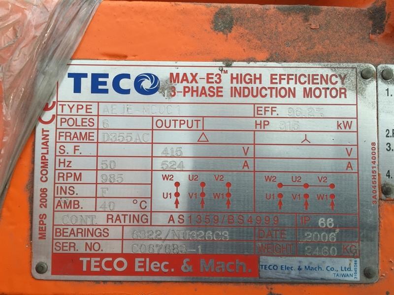 TECO Electric Motor 315kw, 985 rpm, 415V, 524amp, IP66 YOM: 2006 Looks to be new and unused,ex spares roommotor. Excellent condition