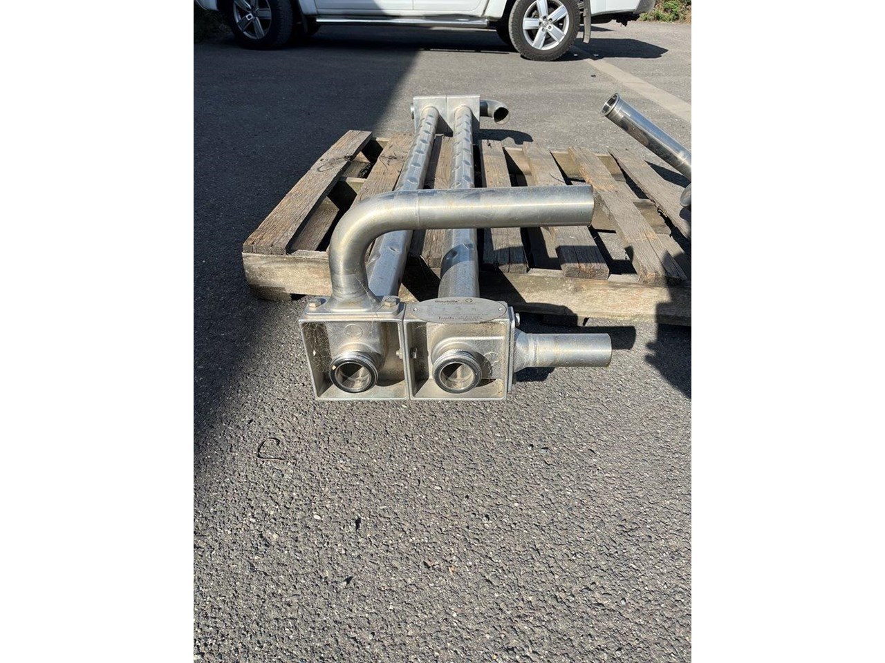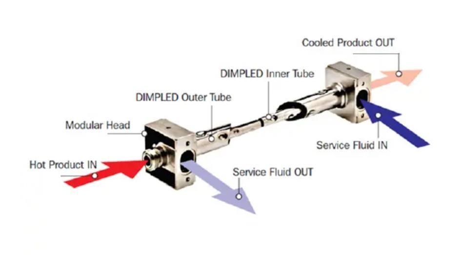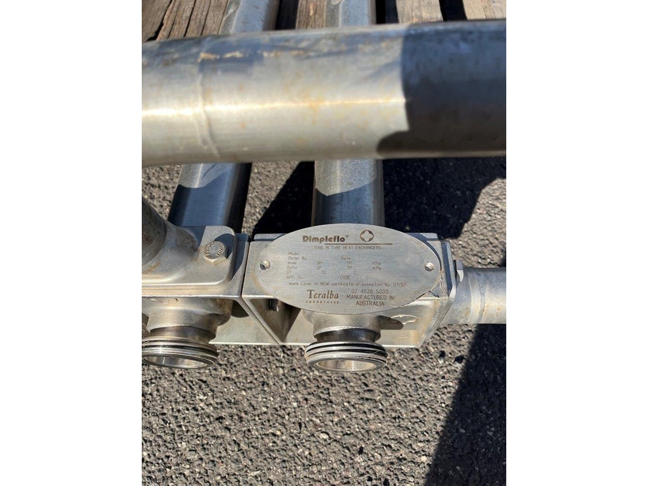 Dimpleflo tube-in-tube heat exchanger. Double tube each measuring 2000mm long Inner DP 400KPa TP 600KPa Outer DP 400KPa TP 600KPa DT -10C to 100C 3 inch product line. 2 inch service fluid line. The Dimpleflo Double Pipe Heat Exchanger (also known as "Tube-in-Tube") is the simplest and most robust configuration of hygienic heat exchanger. Dimpleflo tube in tube heat exchangers are utilised for fluids containing stringy fibres, chunks or other particles and low-high viscosity fluids. A tube in tube heat exchangers involves the product flowing through the inner heat transfer tubes and the service fluid flows through the surrounding shell. Because of its configuration and geometry, the Dimpleflo Double Tube heat exchanger is a true counter current heat exchanger providing absolute product integrity. Using dimple tube technology, both heat transfer and efficiency are increased over conventional smooth tube heat exchangers. A further benefit the turbulence enhancing dimples is potential fouling is minimised, especially for fouling and viscous product