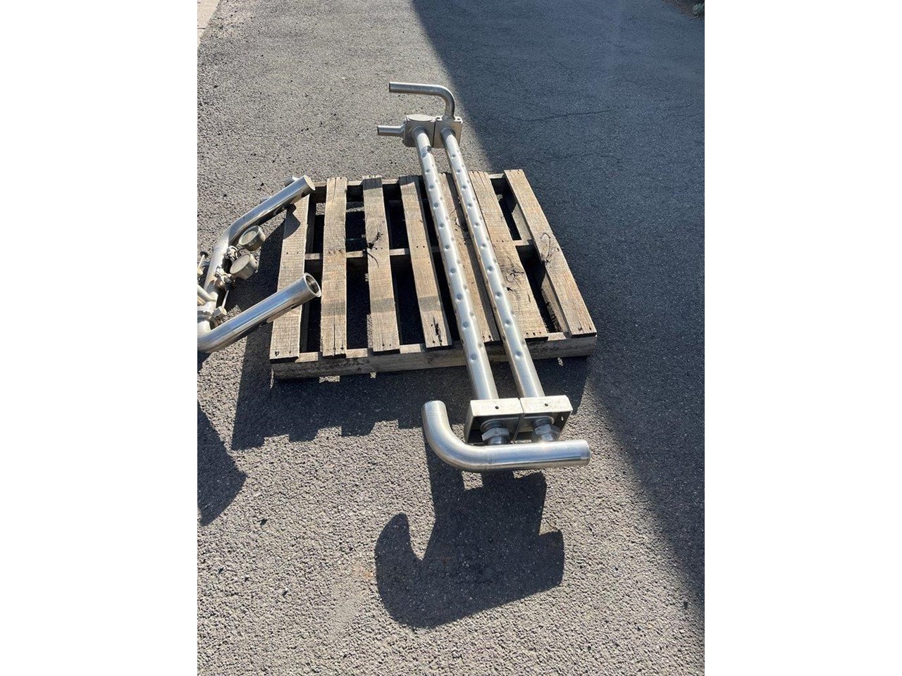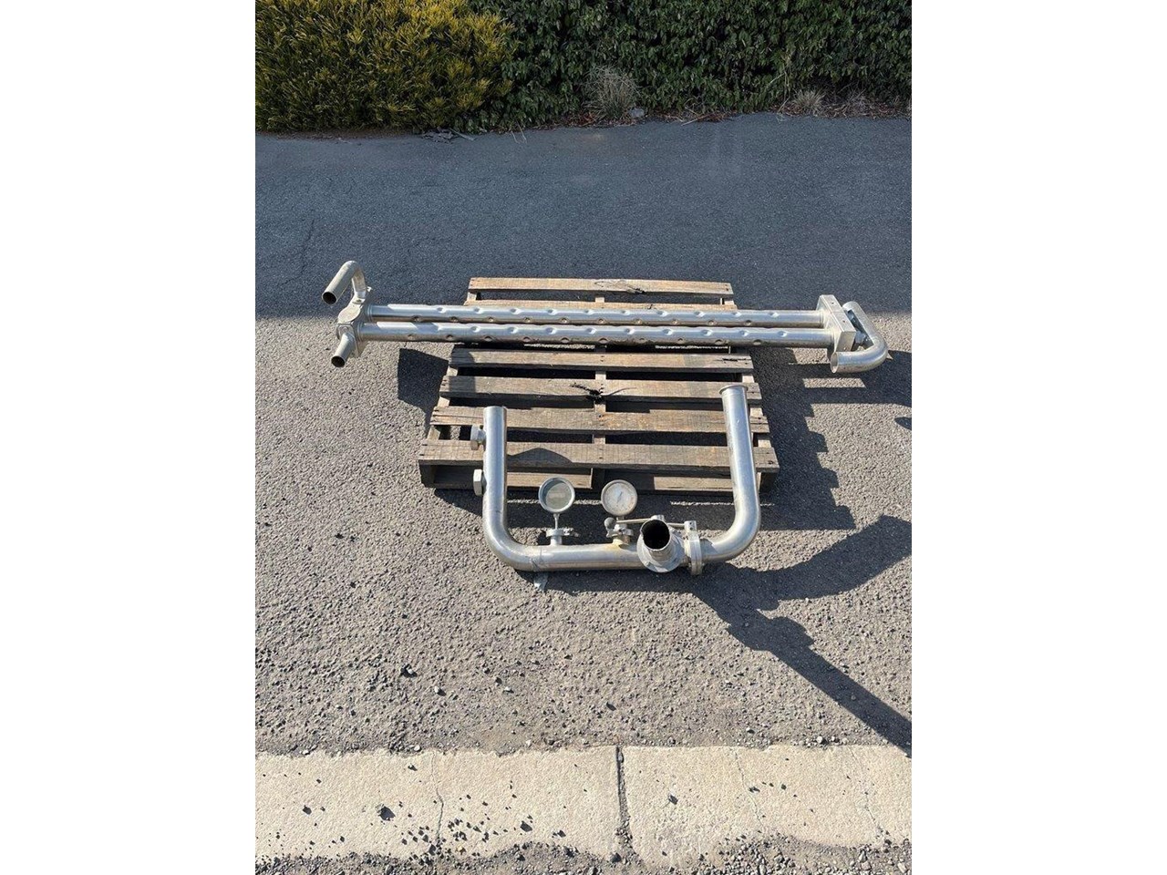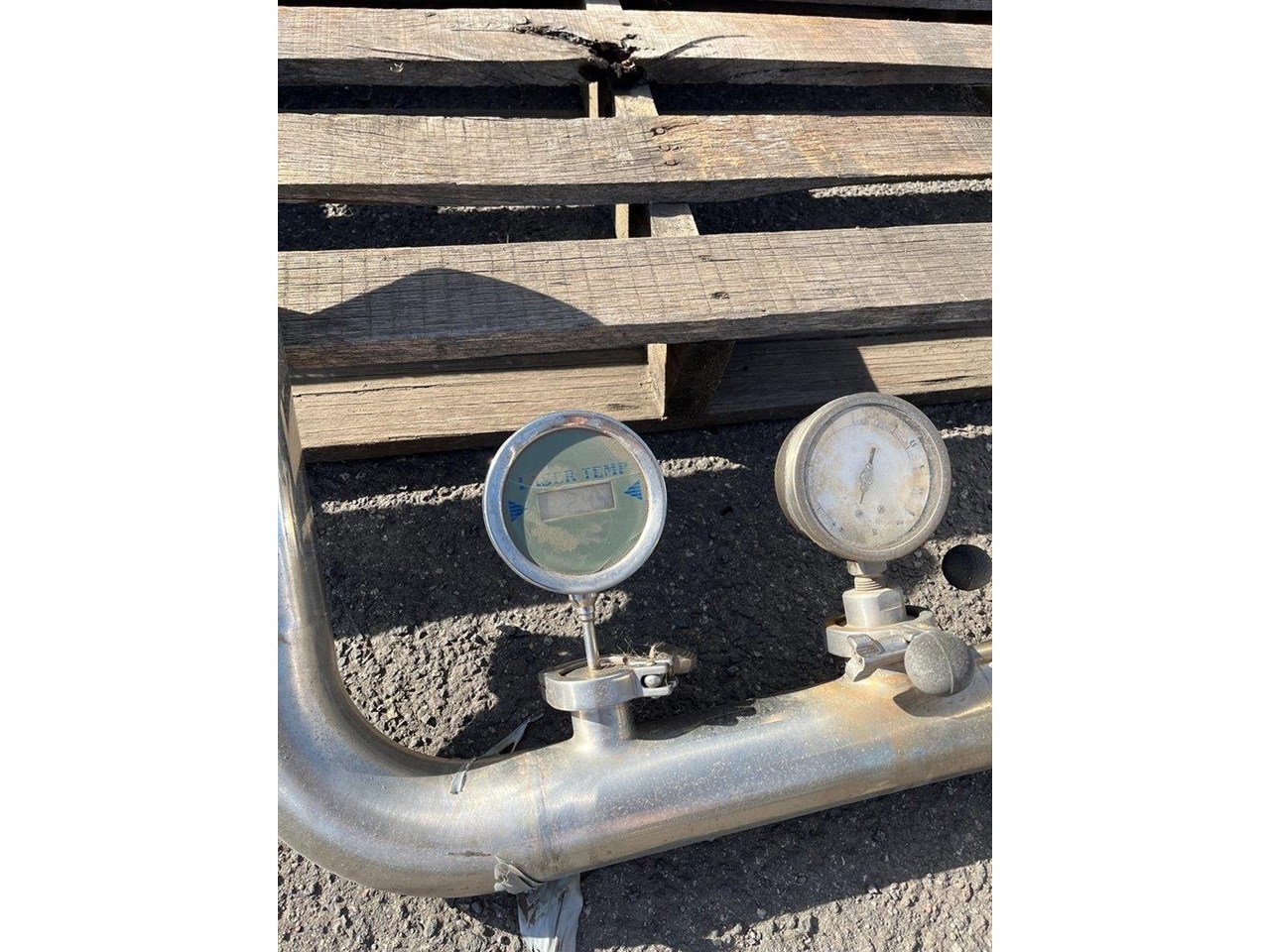 Dimpleflo tube-in-tube heat exchanger. Double tube each measuring 2000mm long Inner DP 400KPa TP 600KPa Outer DP 400KPa TP 600KPa DT -10C to 100C 3 inch product line. 2 inch service fluid line. The Dimpleflo Double Pipe Heat Exchanger (also known as "Tube-in-Tube") is the simplest and most robust configuration of hygienic heat exchanger. Dimpleflo tube in tube heat exchangers are utilised for fluids containing stringy fibres, chunks or other particles and low-high viscosity fluids. A tube in tube heat exchangers involves the product flowing through the inner heat transfer tubes and the service fluid flows through the surrounding shell. Because of its configuration and geometry, the Dimpleflo Double Tube heat exchanger is a true counter current heat exchanger providing absolute product integrity. Using dimple tube technology, both heat transfer and efficiency are increased over conventional smooth tube heat exchangers. A further benefit the turbulence enhancing dimples is potential fouling is minimised, especially for fouling and viscous product