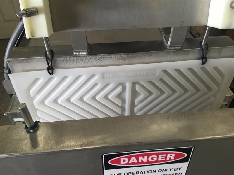 The Fresh Press - FP100 Commercial Cold Press Juicer NEW - Made in Australia This is the ideal cold press juicer for any start up juice bar, health food store, cafe etc. Easy to use Mounted on stainless steel castor wheels for easy mobility. Single phase 240 volt power input. Excellent pressing capability via two hydraulic rams, approx 12 tonnes of pressing force Made from Stainless Steel 316 material Stainless Steel 316 Shredder blade PLC Controlled and screen display. Capacity of approx 100 lt/hr depending on product. 20Lt capacity stainless steel juice tray. Weight of the press is 325KGS Foot print dimensions are 1m x 1.2m. Australian Electrical Compliance. Fruit or Veg is loaded into the stainless steel chute which directs the fruit down into the shredder, once shredded it falls into the specially designed filter bag, then the juice can be pressed out of the bag easily with the touch of a button. Pressed juice is the most natural juice of them all. The juice is squeezed right out of the fruit making it almost living and preserving all the antioxidants, nutrients vitamins and minerals. Once you have tried a pressed juice you won't go back. Thinking of starting up a juice bar, if so this is the ideal machine for you. We have a demo machine in store so book a time and come in to see how easy it is to operate and make cold pressed juice. World wide delivery.