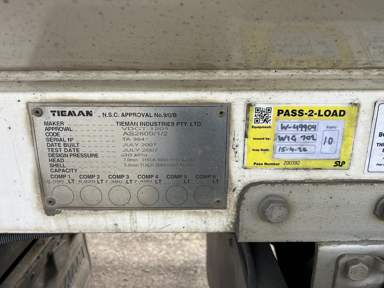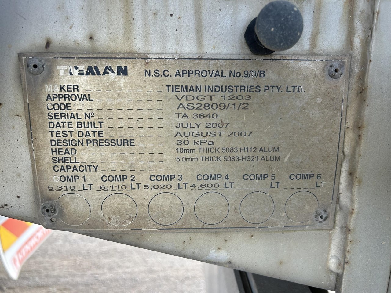 | Title | 2007 TIEMAN 19 METRE ALUMINIUM FUEL TANKER WITH PUMPING GEAR |