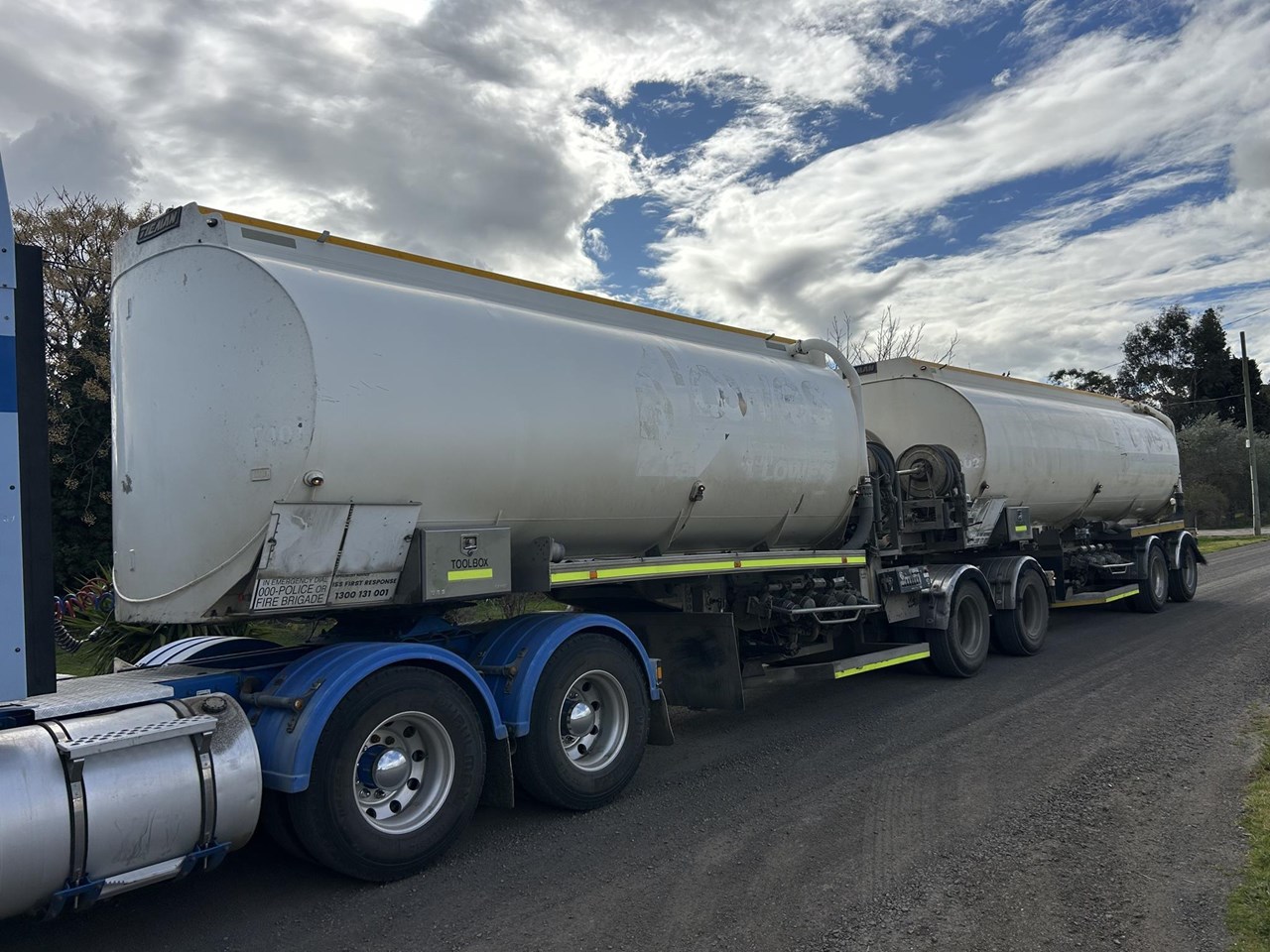 2007 build Tieman 19 metre B double Fuel Shifter . A and B tankers are both 28500 litres 4 compartments with 2 sets of digital metres pumps and hose reels on each tanker . Current hydro was in the terminal , working in a major fuel company fleet . BPW Eco Plus on airbag suspension with EBS brakes , Led lights , legs on both tankers . Please note the Diptronics have been removed .