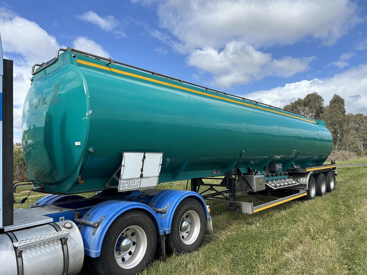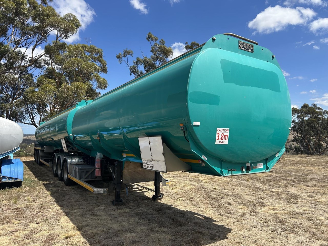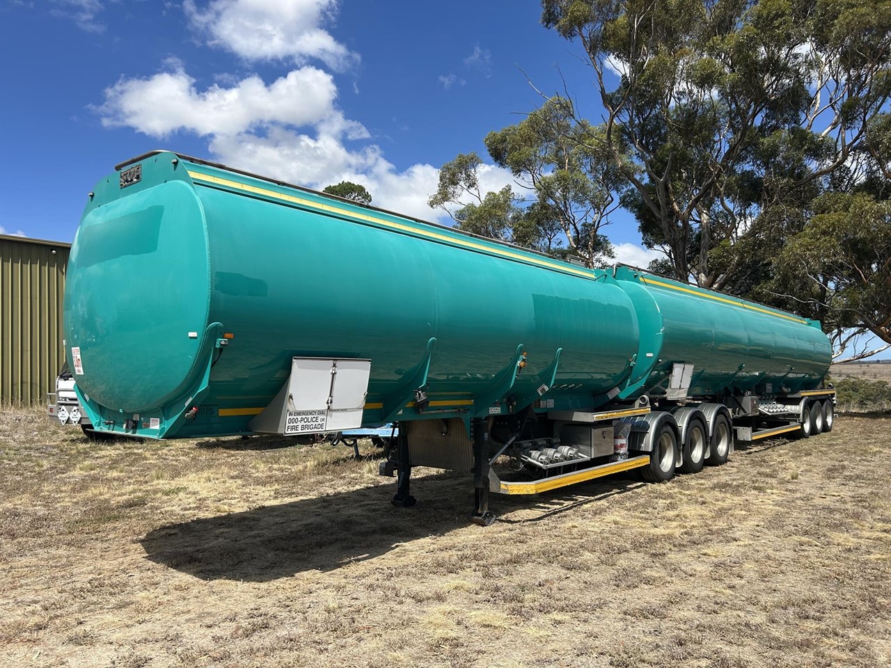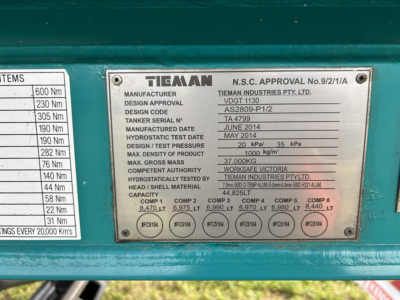Tieman 2014 build 45,000 L six compartment Triaxle aluminium Fuel Tanker bottom load vapour recovery. Hendrickson axles on Hendrickson airbag suspension with EBS brakes on new air bags breaks slack adjusters and boosters underground protection air operated safety rails straight from a major Fuel transport company we can supply an A trailer to make a 25 m B double at extra cost .