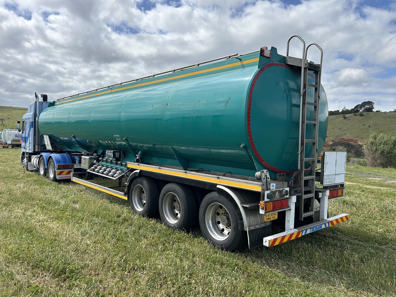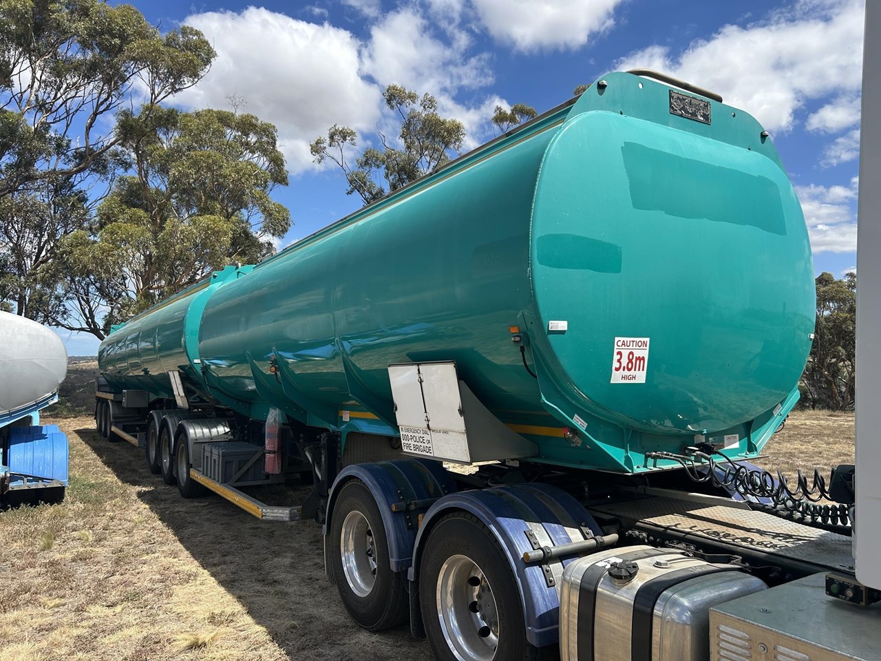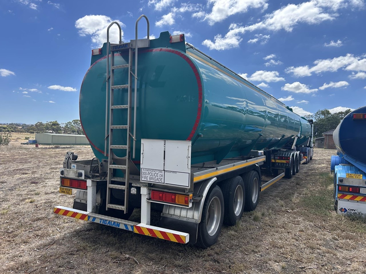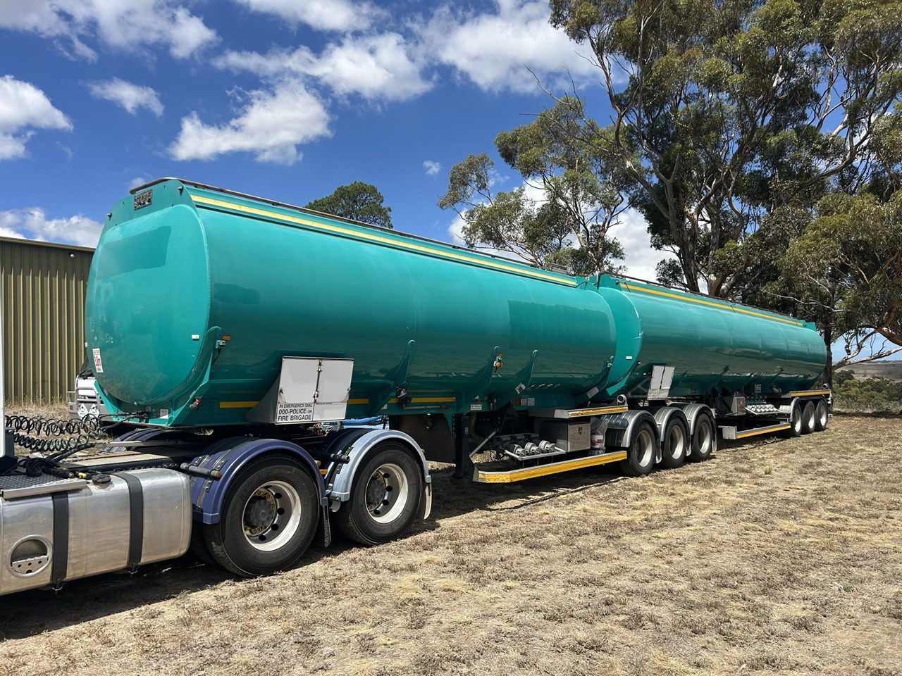 Tieman 2014 build 45,000 L six compartment Triaxle aluminium Fuel Tanker bottom load vapour recovery. Hendrickson axles on Hendrickson airbag suspension with EBS brakes on new air bags breaks slack adjusters and boosters underground protection air operated safety rails straight from a major Fuel transport company we can supply an A trailer to make a 25 m B double at extra cost .