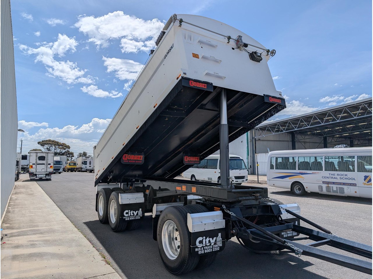 ATM: 26,000kg, 5.9m Long Steel Body, Draw Bar with Spring Tensioners, Dolly Air Lock, TMC Preset Axles, 10 Stud Drum Brake Axles on Airbag Suspension, 285PCD - 8.25x22.5 Alloy Wheels on 11R22.5 Tyres, 2 Way Air Tailgate with Heavy Duty Hinges, Razor Electric Black PVC Tarp with Tarp Protector, Safety Prop, Front Mounted Outer Steps, Duomatic Air Fittings, ABS and 7 Pin Elec, Full Length Spray Suppression Both Sides & 7 x LED Clearance Lights Each Side.