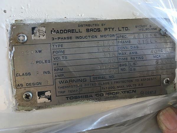 Toshiba 280kw 1480rpm. Frame 315LL.415v3/50hz. Foot Mount. Class F Thermistors fitted. Shaft diam 95mm x 150 long. Over hauled by Nilsen Electrics for CUB. Megger tested 6/3/18 perfect, 200meg.