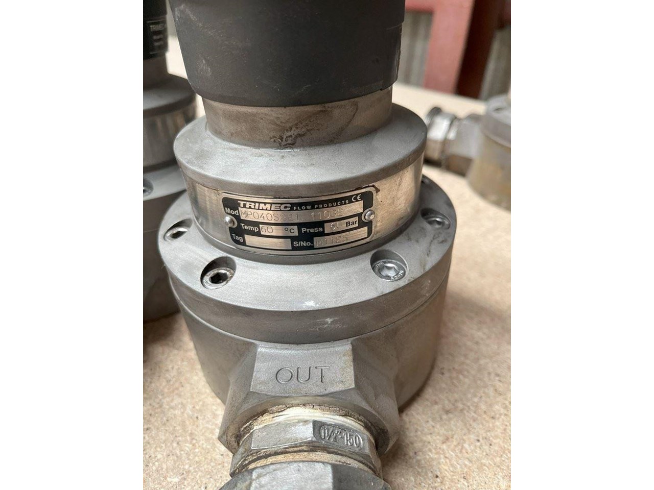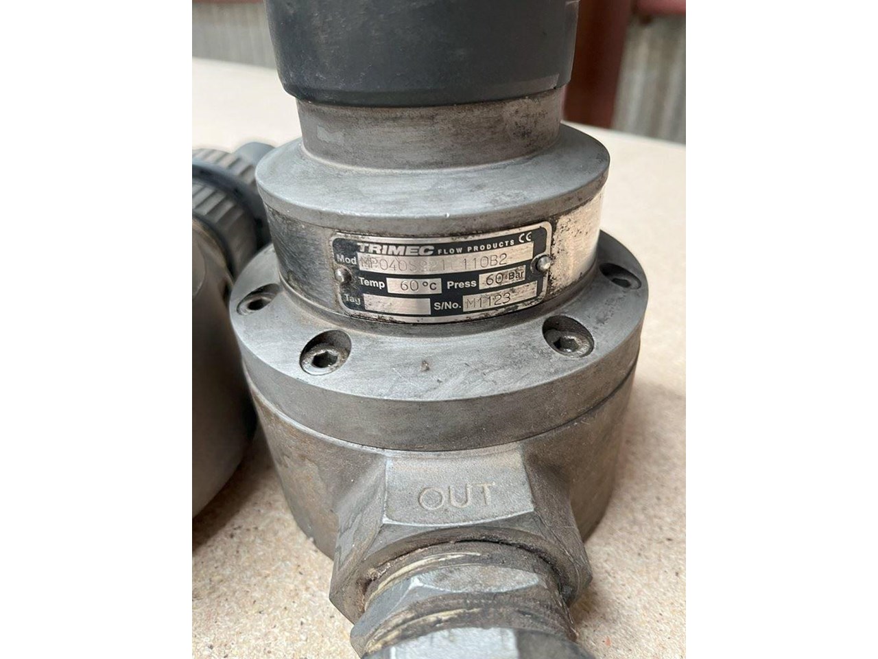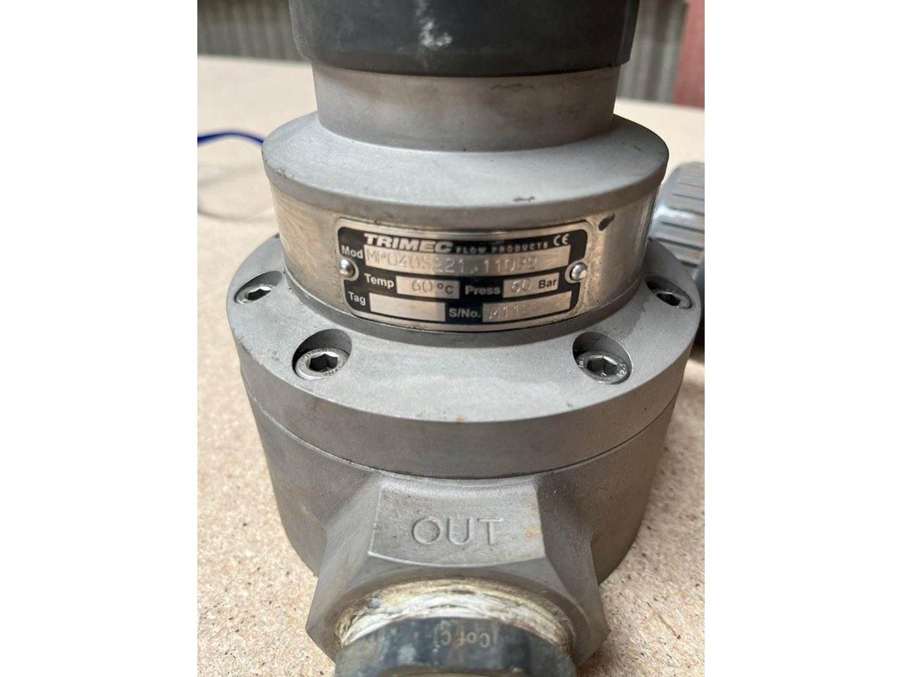 The Multipulse range of positive displacement flowmeters offer a high level of accuracy and repeatability. These precision flowmeters are used for flow rate measurement in flow monitoring and control applications and for totalising in dispensing and batching. Multipulse flowmeters are suitable for use with a wide range of clean liquids including viscous lubricants, chemicals, food bases and non-conductive low viscosity solvents either pumped or gravity fed. Make: Trimec Model: MP040S221 Body Material: SS316 Piston Material: PEEK Partition Material: SS316 O-ring Material: Viton Temp Limits: -40 degrees C to 60 degrees C Process Connection: BSP Threaded Uses: Alcohols, acetic acid, caustic soda, ethanol, fuels, grease, glucose, ink, insecticides, latex emulsions, liquid sugar, margarine, mayonnaise, molasses, resin, tallow, urethane, water, xylene and liquid yeast. Liquid enters into a precision machined chamber which contains an oscillating piston. The position of the piston divides the chamber into compartments containing an exact volume. The liquid pressure causes the piston to oscillate and rotate its centre hub. The movements of the hub are sensed through the meter wall by a series of magnets. Each revolution of the piston hub is equivalent to a fixed volume of liquid, which is indicated as flow by an indicator or totaliser. Close clearances between the piston and the chamber ensure minimum slippage of the liquid for highly accurate and repeatable measurement of each volume cycle. Features Insensitive to mounting orientation. Measure low and high viscosity liquids. Has only one moving part (oscillating piston). Has no stagnate chambers to accumulate contaminants or stale products. Certified Exd hazardous area versions in all sizes. No need for flow conditioning (straight pipe run etc). Limited number of spares parts needed to support the product. Extremely compact and comparatively lightweight. Applications Applications include alcohols, acetic acid, caustic soda, ethanol, fuels, grease, glucose, ink, insecticides, latex emulsions, liquid sugar, margarine, mayonnaise, molasses, resin, tallow, urethane, water, xylene