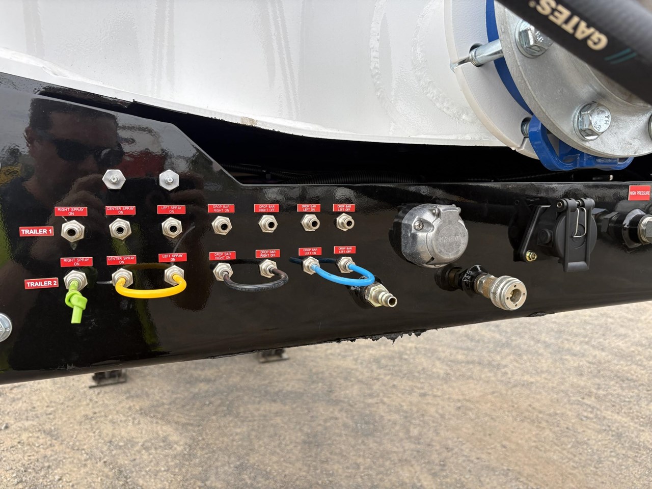 2 x Gravity feed drop bars 500mm long on L/R hand side of tank end individually air operated with butterfly valve with 4 male camlocks Hose reel with hose and nozzle on rear of tank