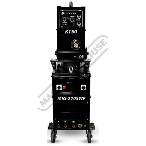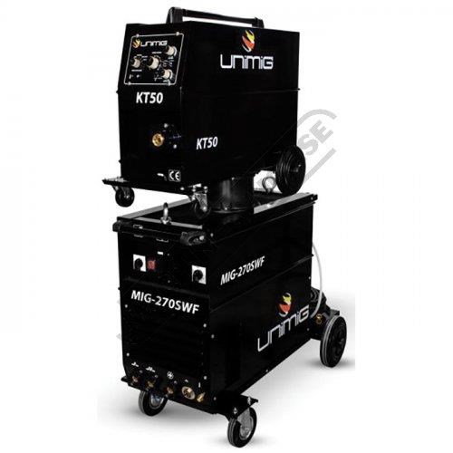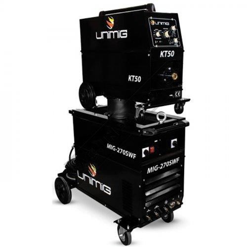 The UNI-MIG 270 SWF is supplied with a completely enclosed KT 50 wire feed unit which helps prevent dust and moisture fouling your wire and contaminating your weld. It comes with a set of fully covered 10 metre interconnecting cables, a swivel turntable for the wire feed unit and wheels for increased maneuverability.