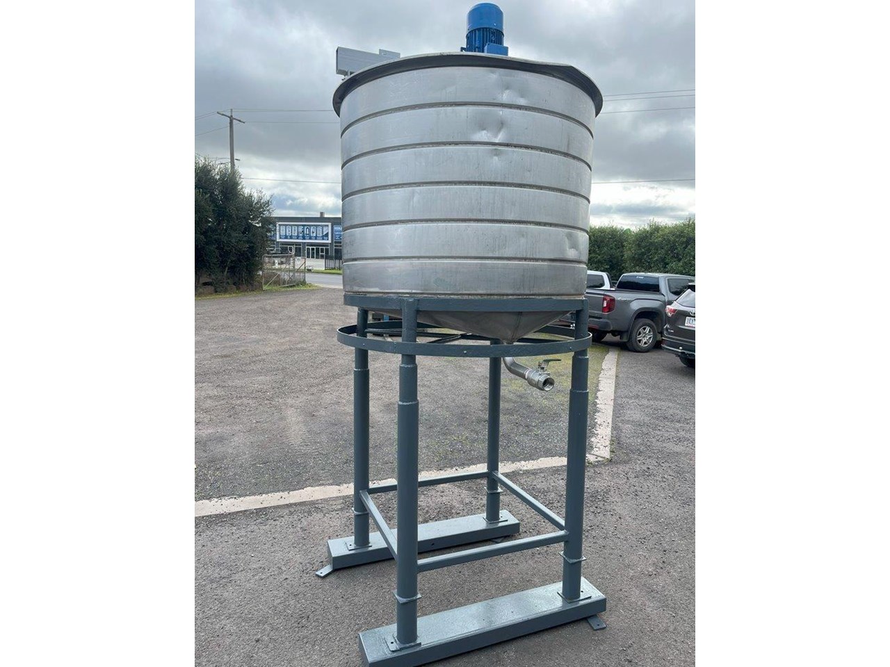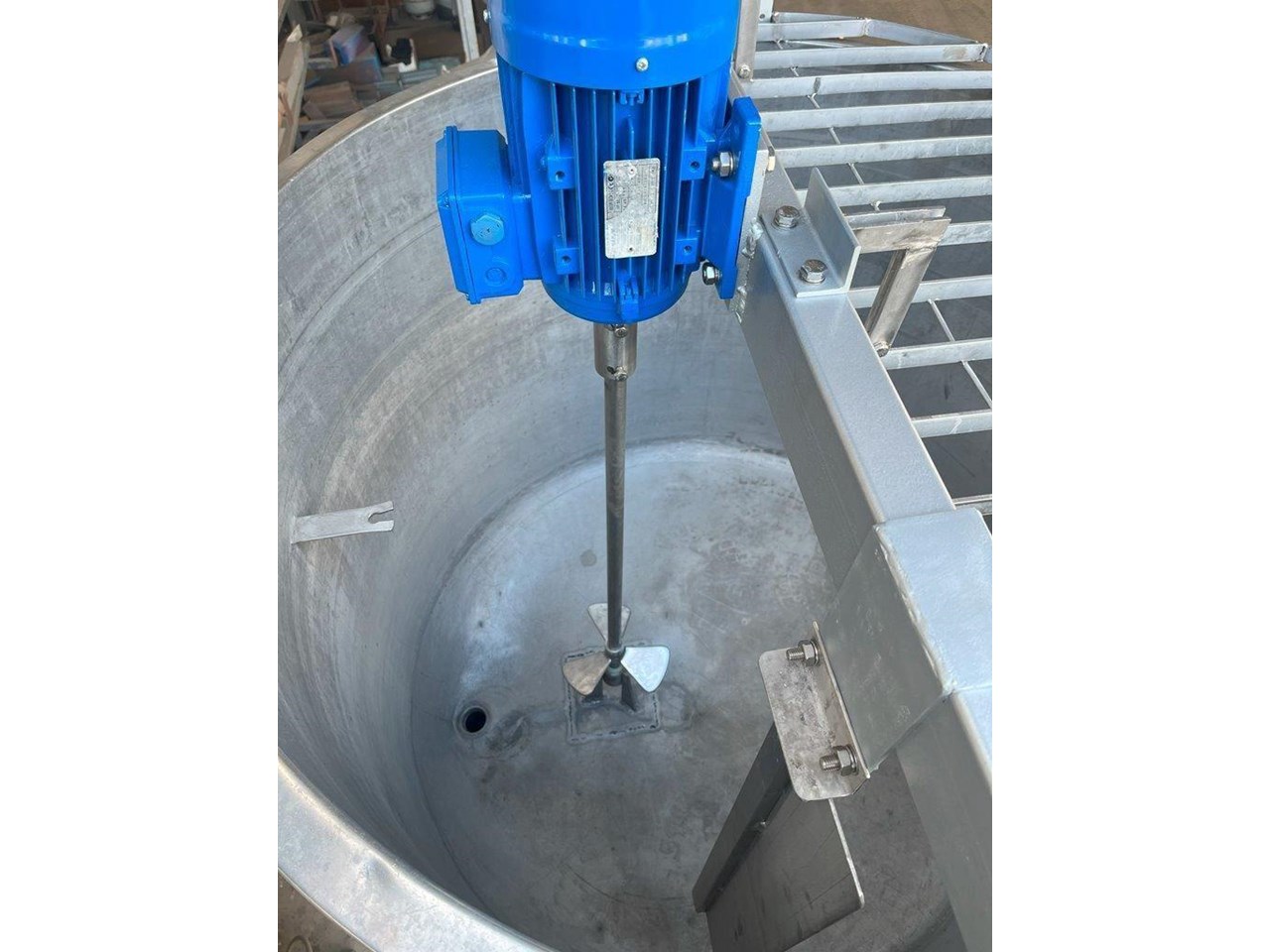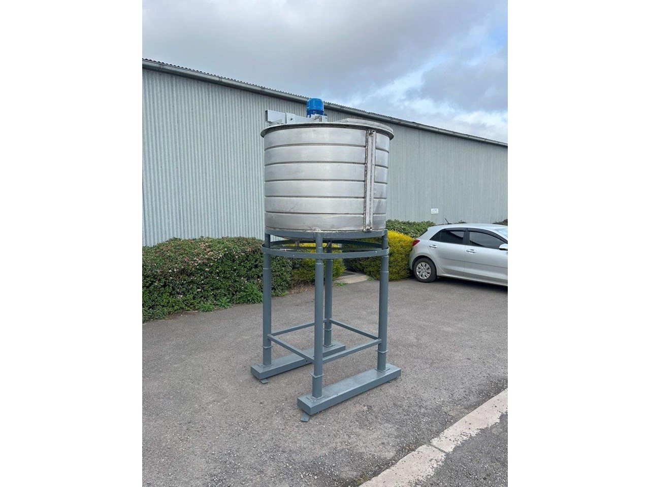 Stainless steel tank with mixer and jacket. 1150 Litres. 3 Phase 415V 1.5kW Motor with stainless steel mixing prop and shaft. RPM: 1410 Tank has a sloped bottom to a 1.5