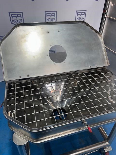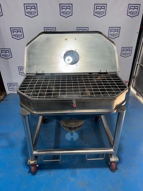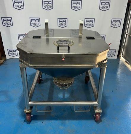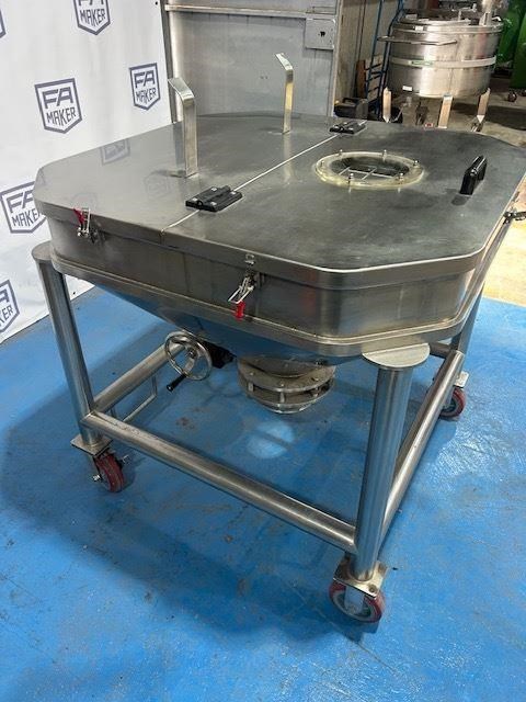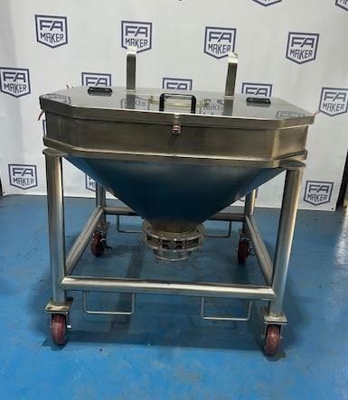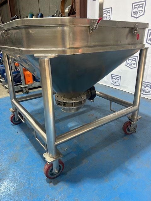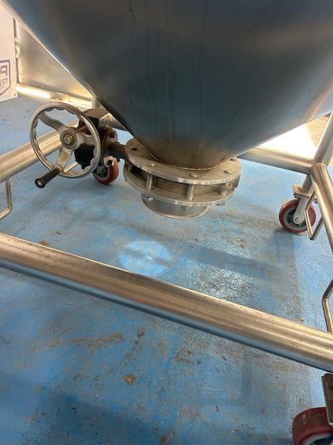 Stainless Steel portable storage hopper, conical discharge with butterfly valve outlet. 250Litre capacity This portable SS holding bin has a hinged lid with a grate under the lid - 200mm dia butterfly valve - Forklift points - Castor Wheels Excellent condition, heavy duty, very clean inside and out, ex food factory. Overall Dims 1.1m x 1.1m x 1.05m high
