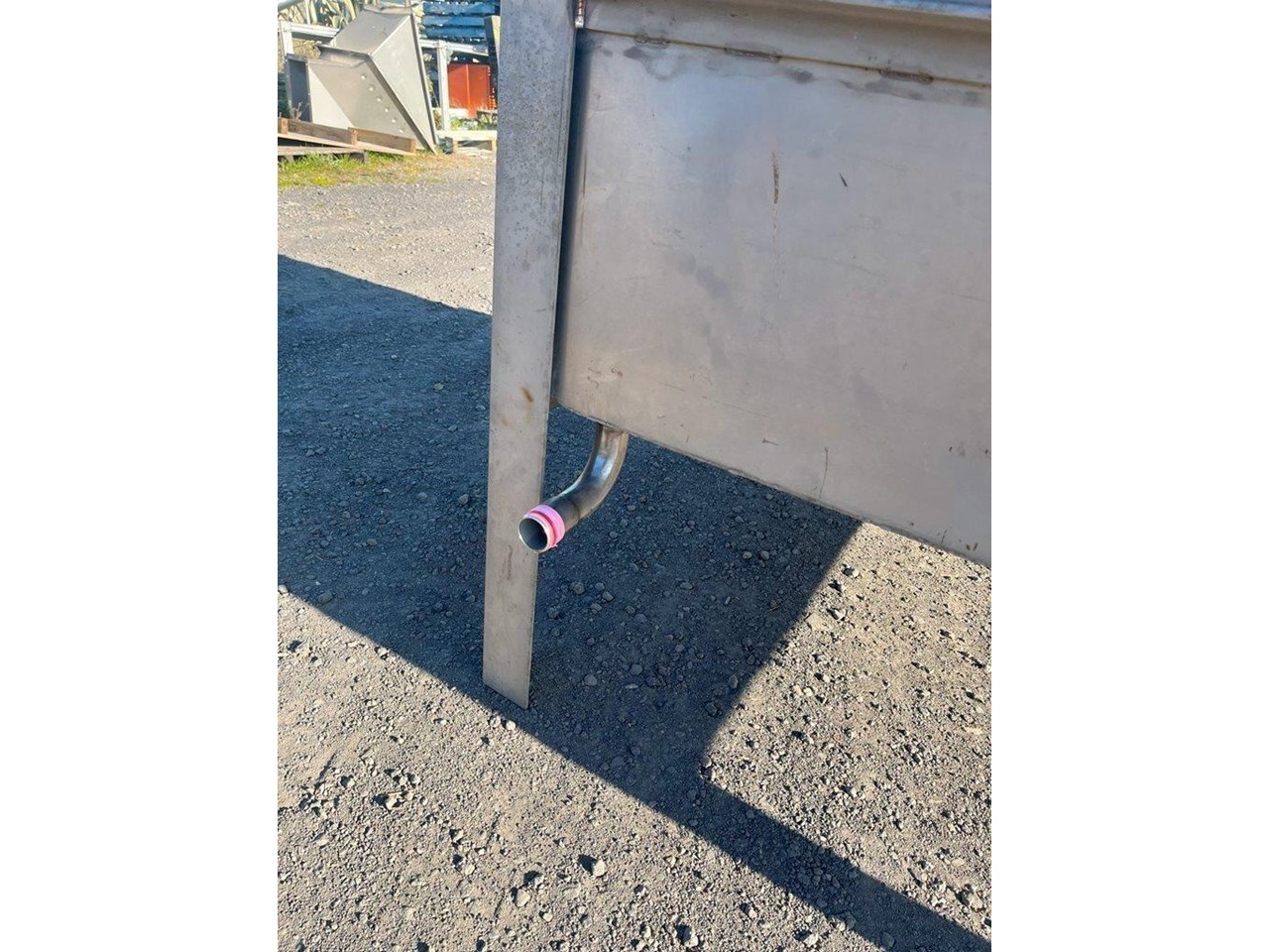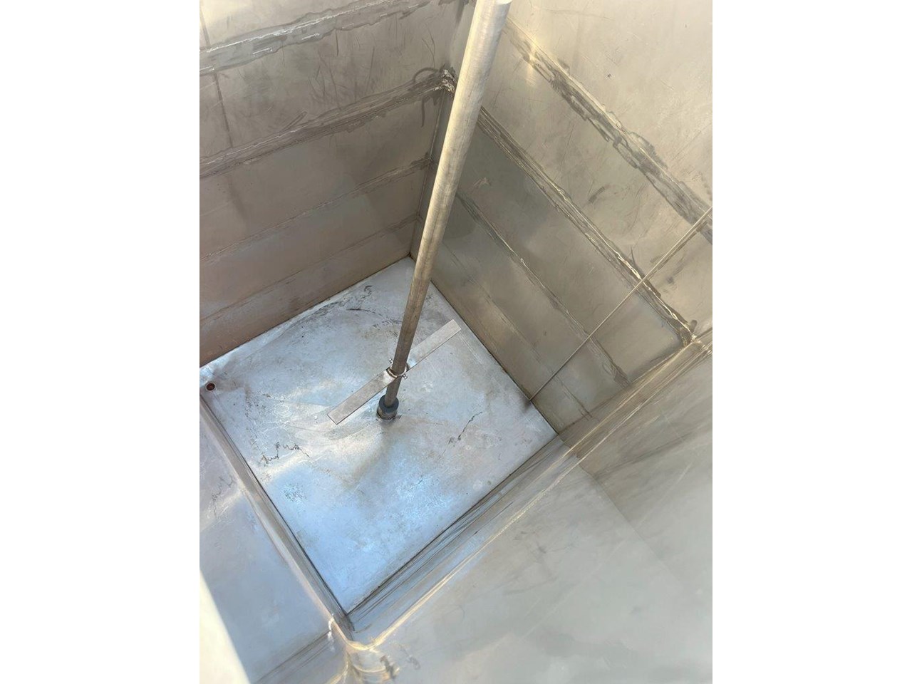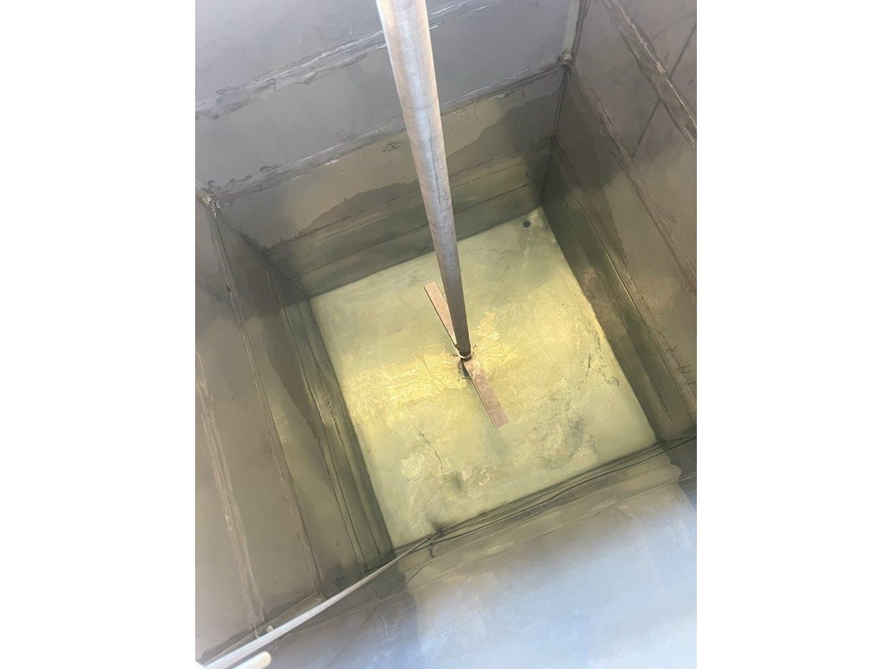3100 Litre stainless steel square mixing tank. Sloped bottom to 1.25inch BSP Outlet. 3 Phase 415V 0.75kW SEW Geared motor. Agitator 129 RPM. Level indicating sightglass. Overall height 2880mm Leg Height 430mm Width 1300mm Runs well