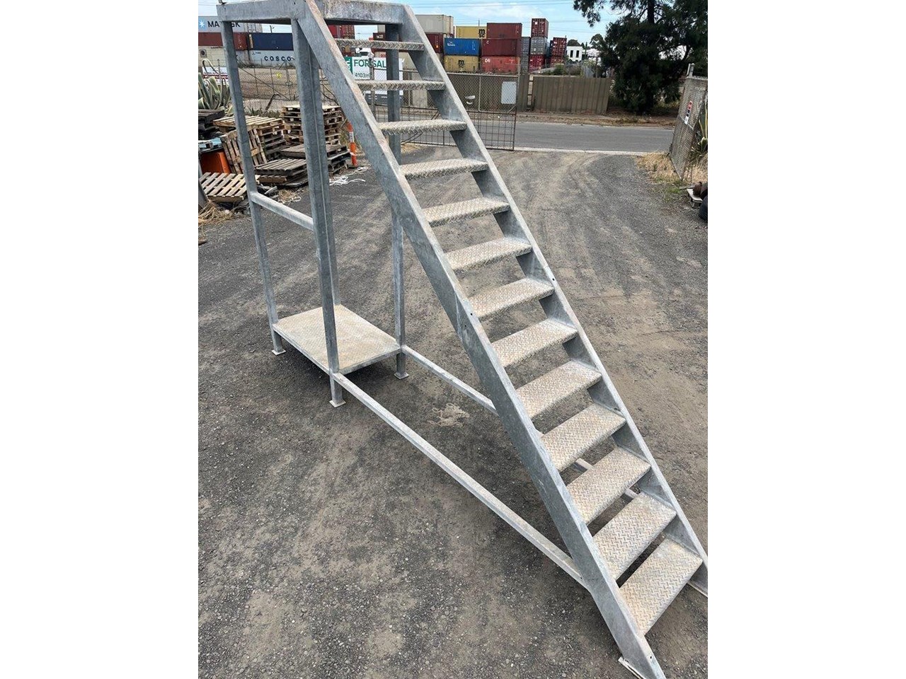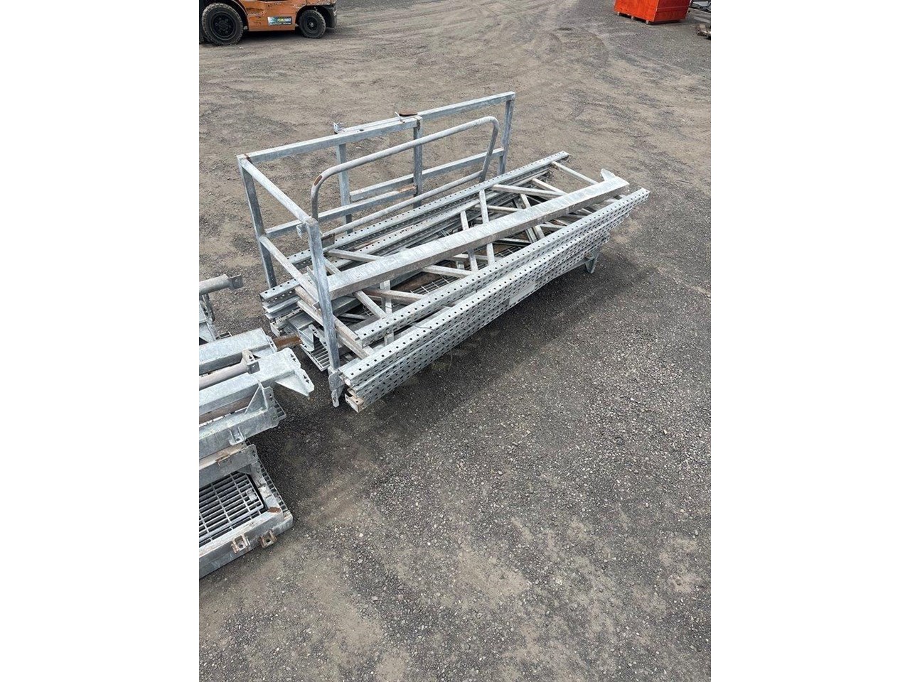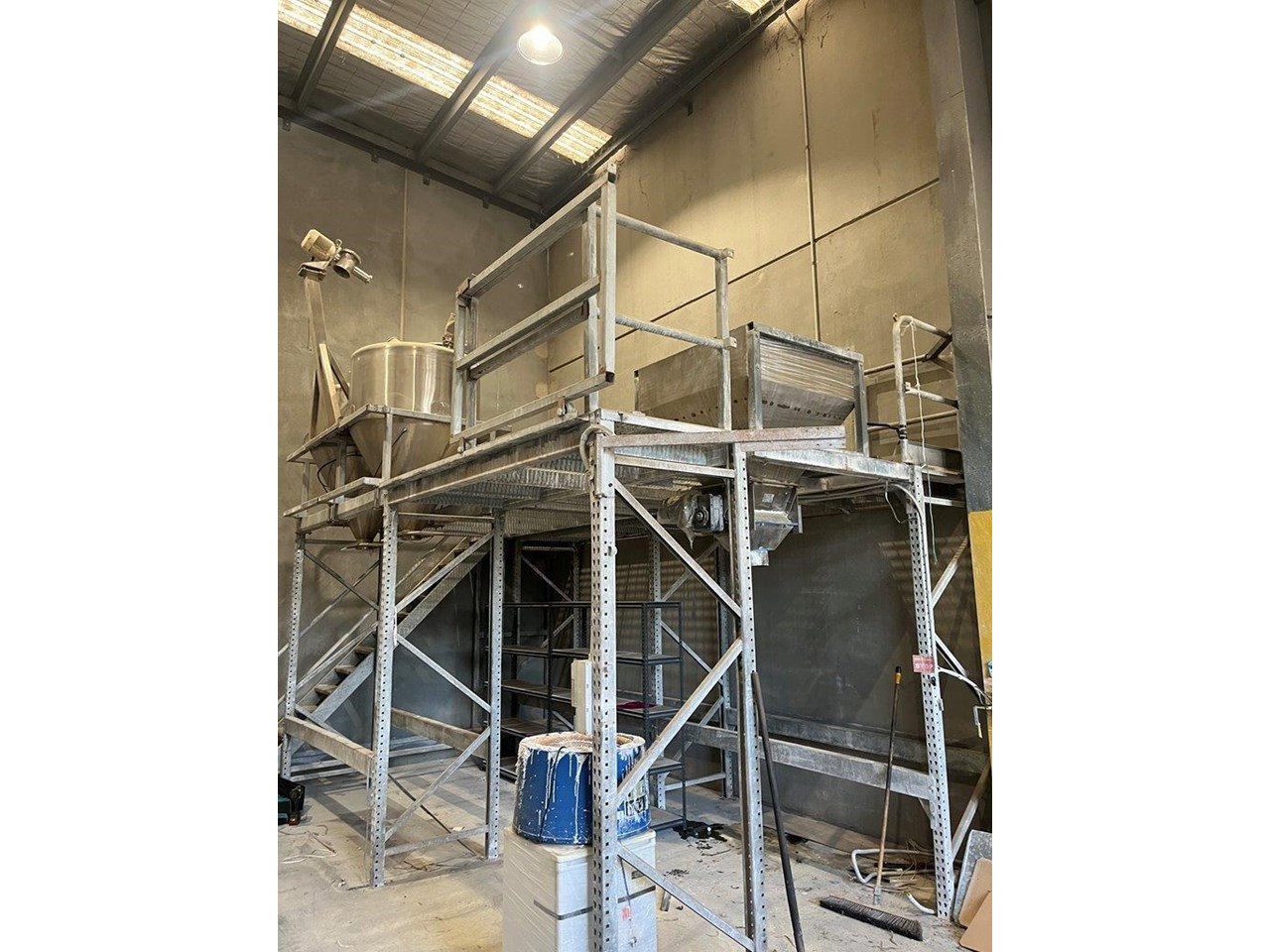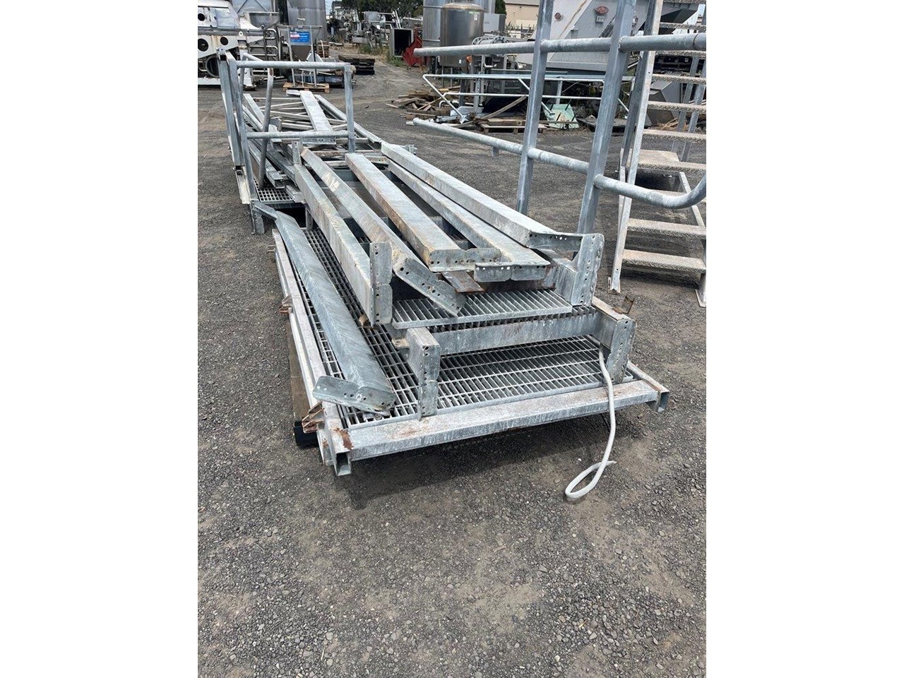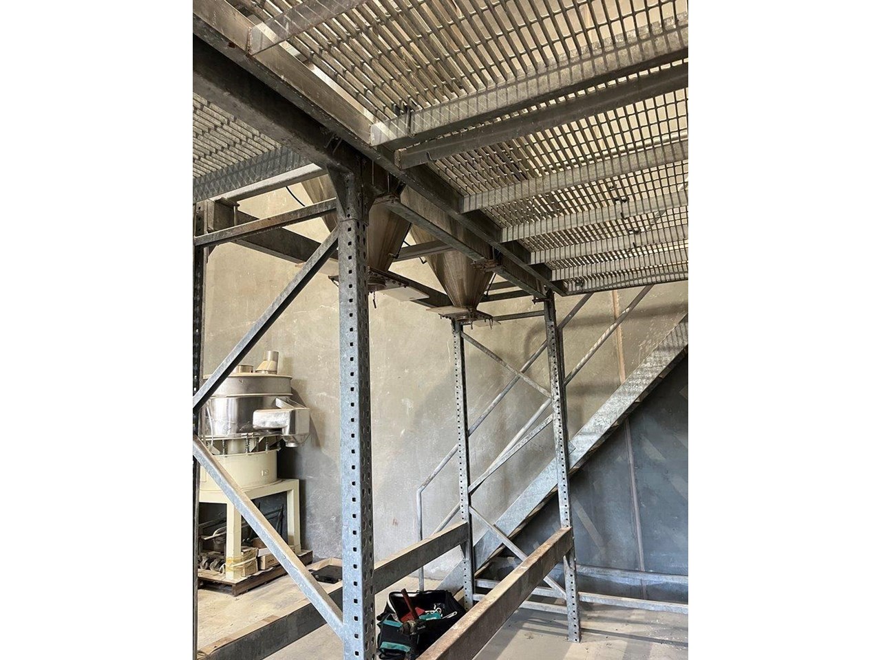 Galvanised steel platform with stairs. Platform dimensions 3500mm x 7000mm x 2700mm High. Stair landing dimensions 695mm x 1105mm. Stair Overall dimensions are 700mm W x 3990mm L x 2700mm H Platform has been removed from warehouse and flat packed. Hopper's and rotary valve are NOT included.