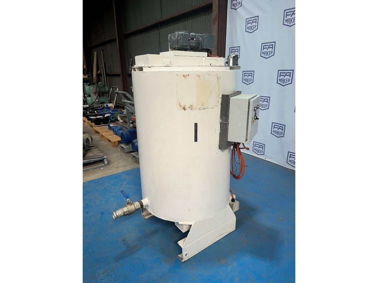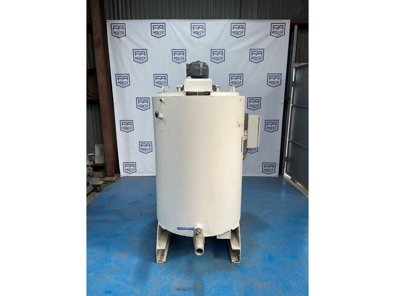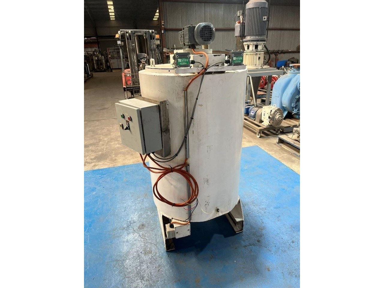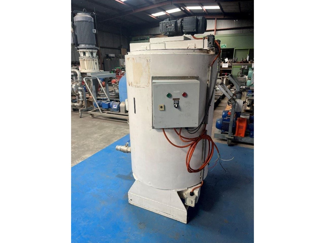 400L Mild steel jacketed melting tank with slow speed mixer. Last used for mixing and keeping warm, confectionary cream. 2 inch outlet. 690mm dia x 1070mm high. Mixer: 3 Phase, 415V, 0.25kW, 8RPM. Tank is heated via a 193 Watt electric element with temp controller. Current set point is 60C. Maximum set point 110C. 2 Hinged lids with cutout saftey switches. Forklift pockets to underside of tank. Minor dents and scratches. Mixer runs very well and heating element works well also. Tank will need a clean. Price is for unit as is. Overall height: 1750mm