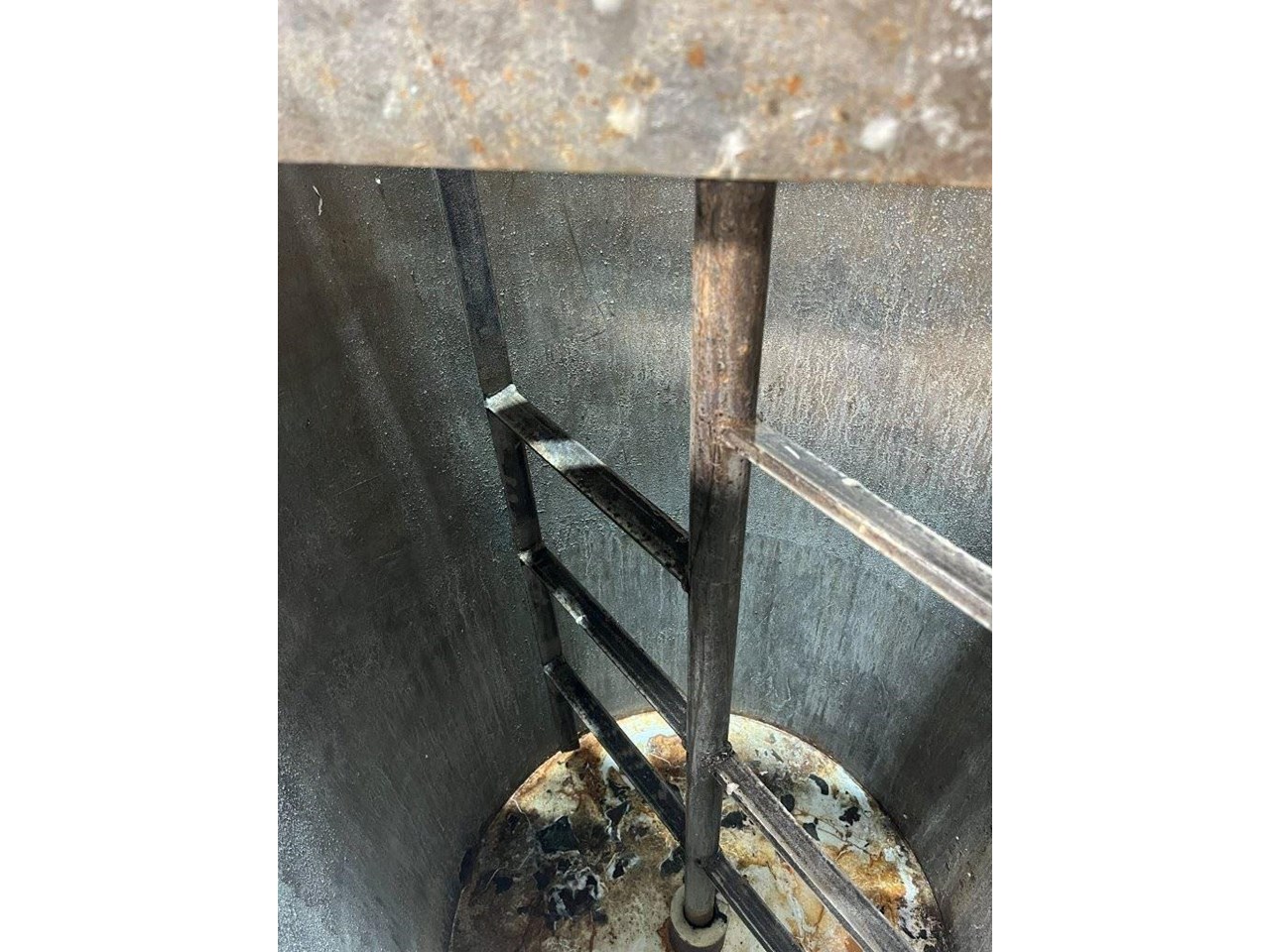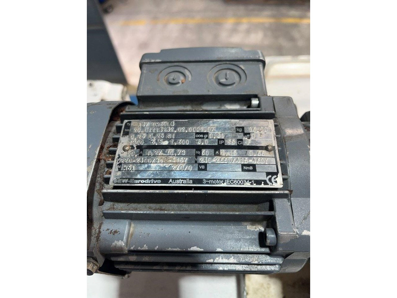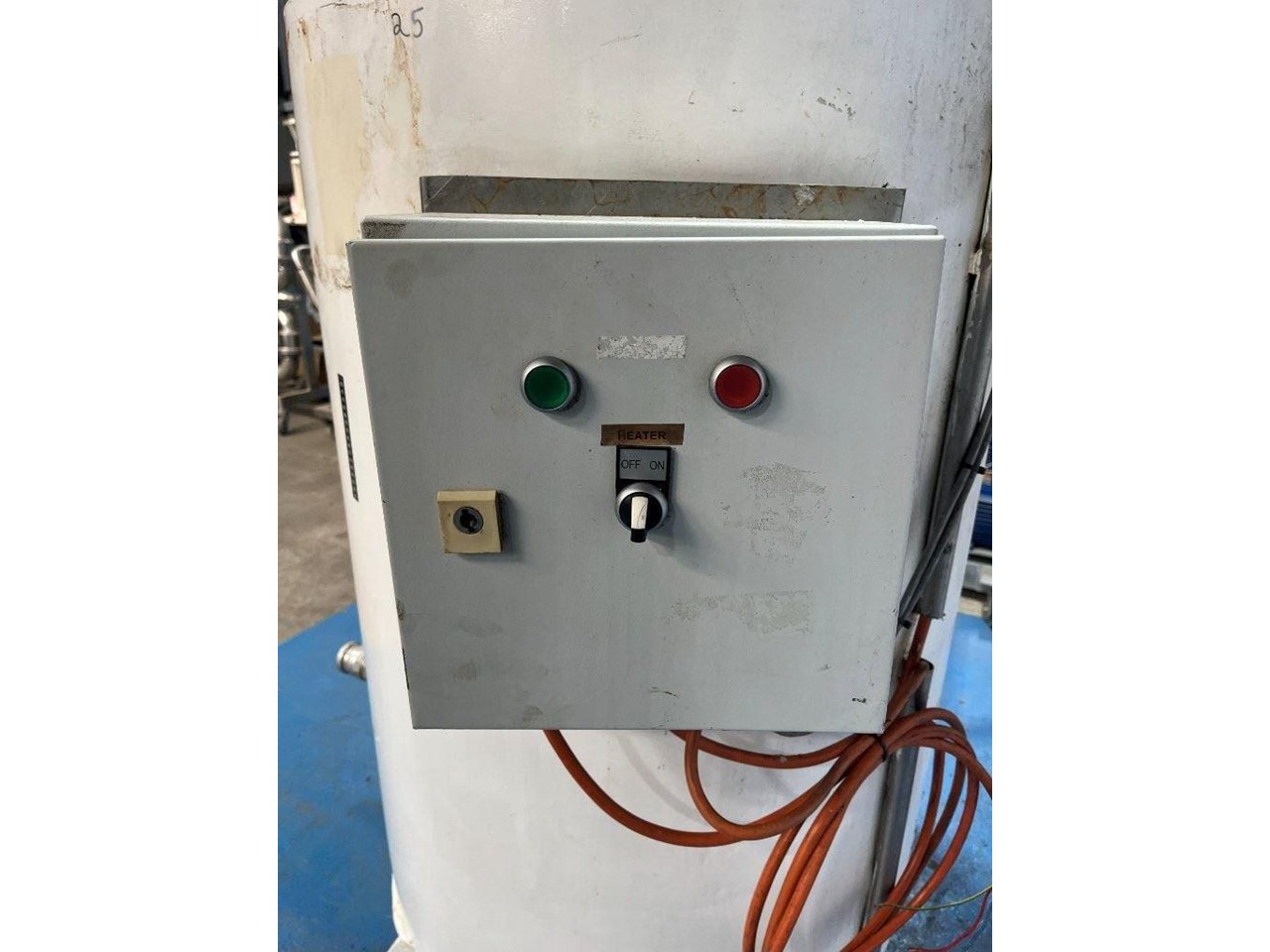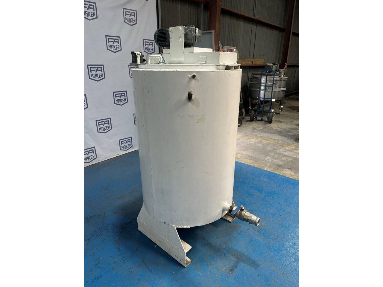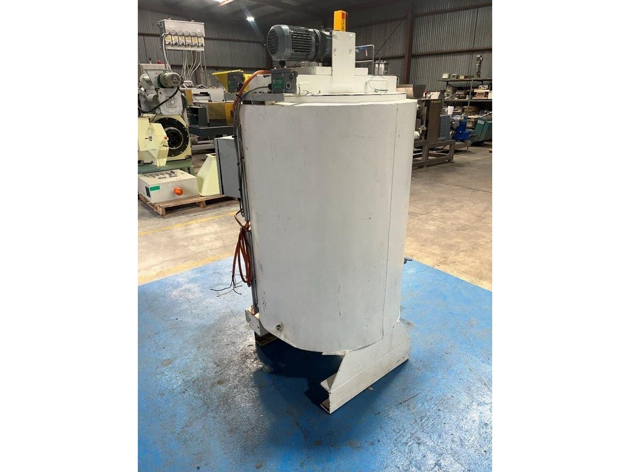 400L Mild steel jacketed melting tank with slow speed mixer. Last used for mixing and keeping warm, confectionary cream. 2 inch outlet. 690mm dia x 1070mm high. Mixer: 3 Phase, 415V, 0.25kW, 8RPM. Tank is heated via a 193 Watt electric element with temp controller. Current set point is 60C. Maximum set point 110C. 2 Hinged lids with cutout saftey switches. Forklift pockets to underside of tank. Minor dents and scratches. Mixer runs very well and heating element works well also. Tank will need a clean. Price is for unit as is. Overall height: 1750mm