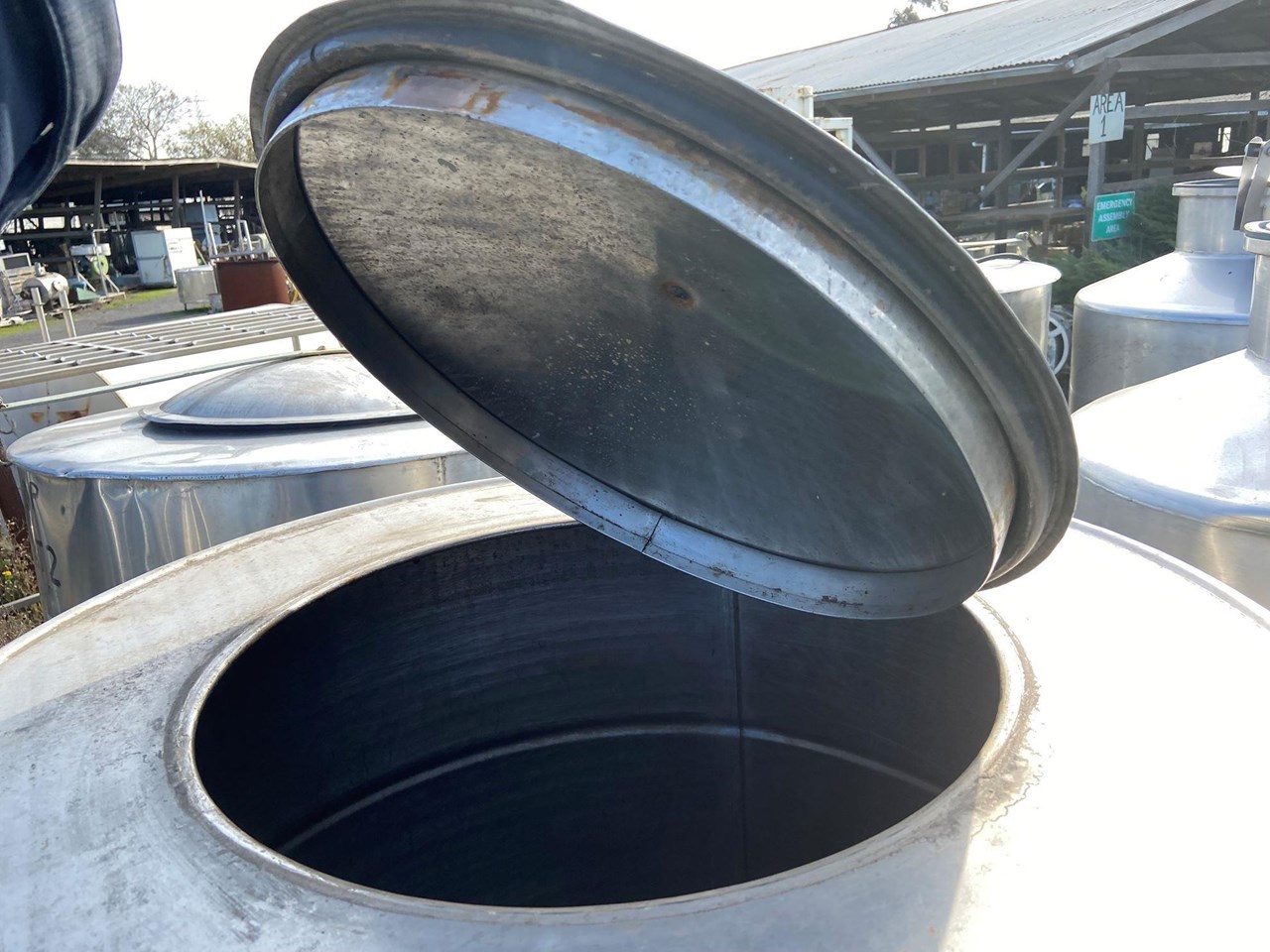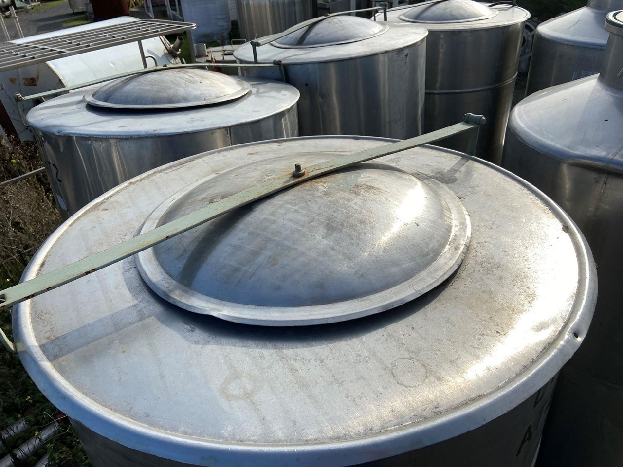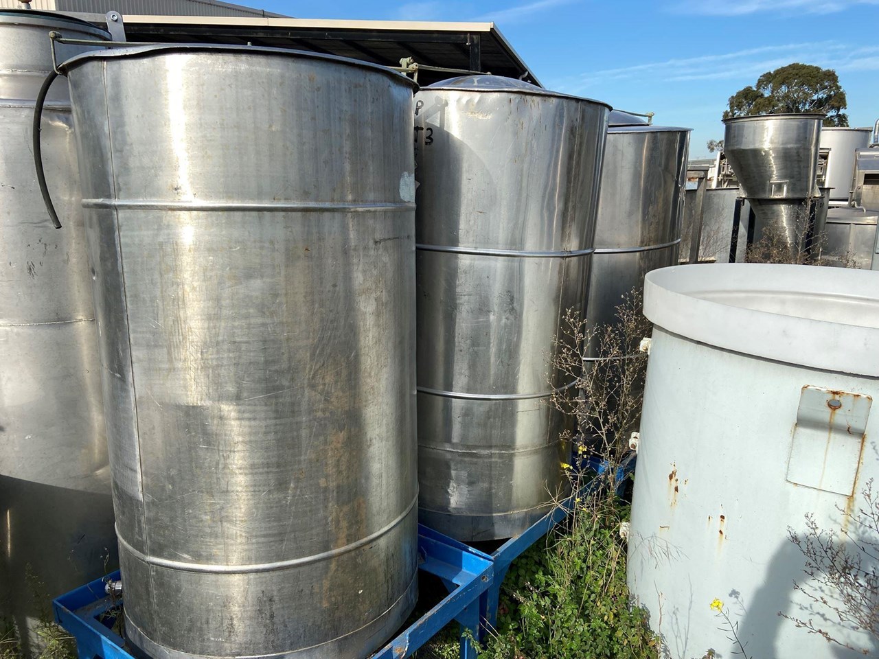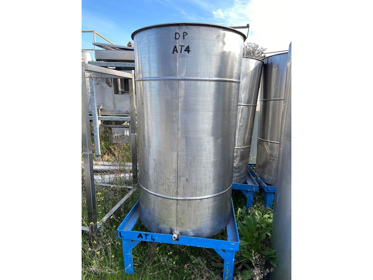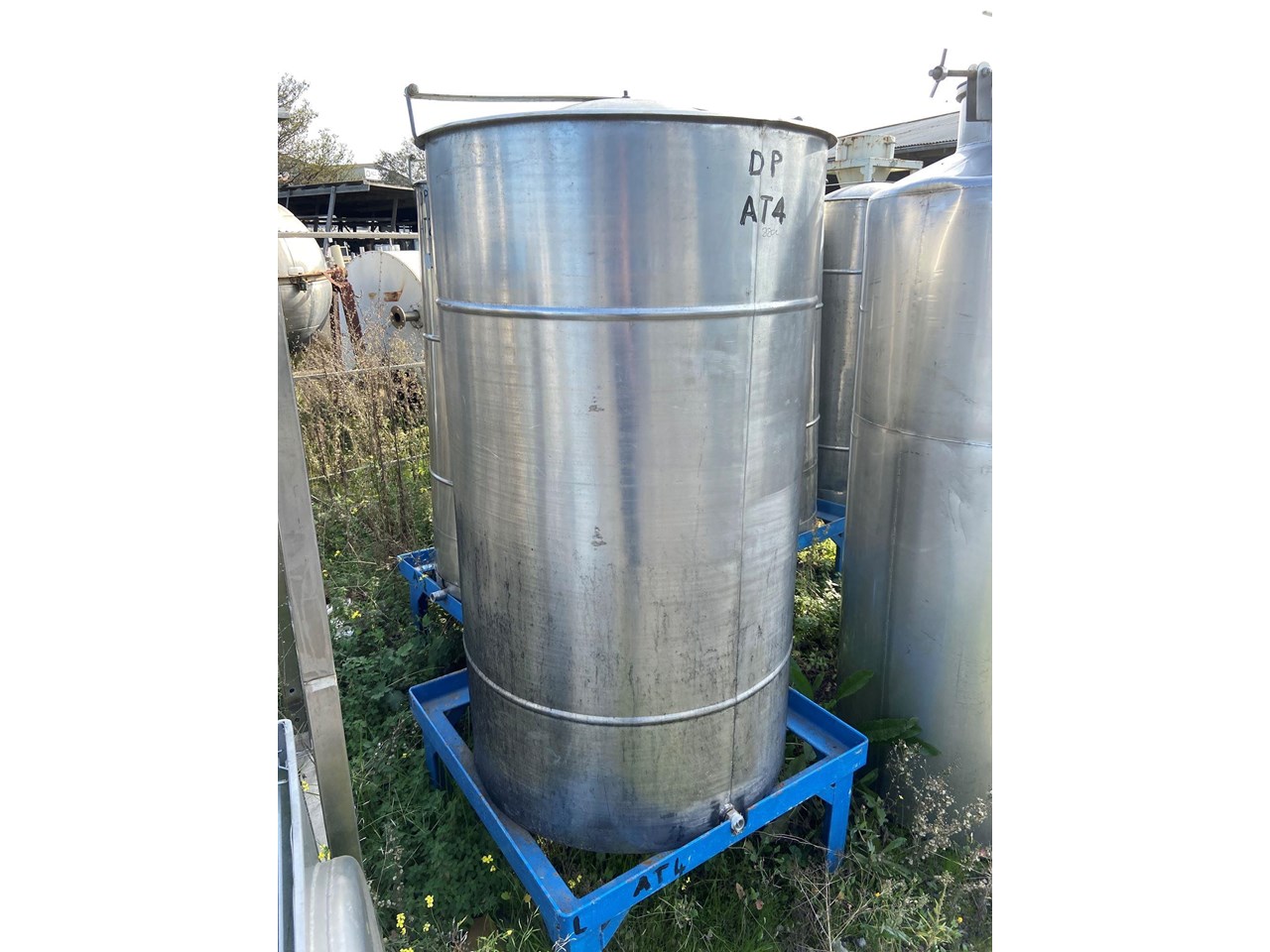Stainless steel storage tank. 800 Litres Flat bottom, closed top with manhole Tank dims 800mm dia x 1550mm tall On a steel base with the outlet 400mm from the ground Outlet is 30mm Overall height is 2000mm 4 tanks available. Price per tank.