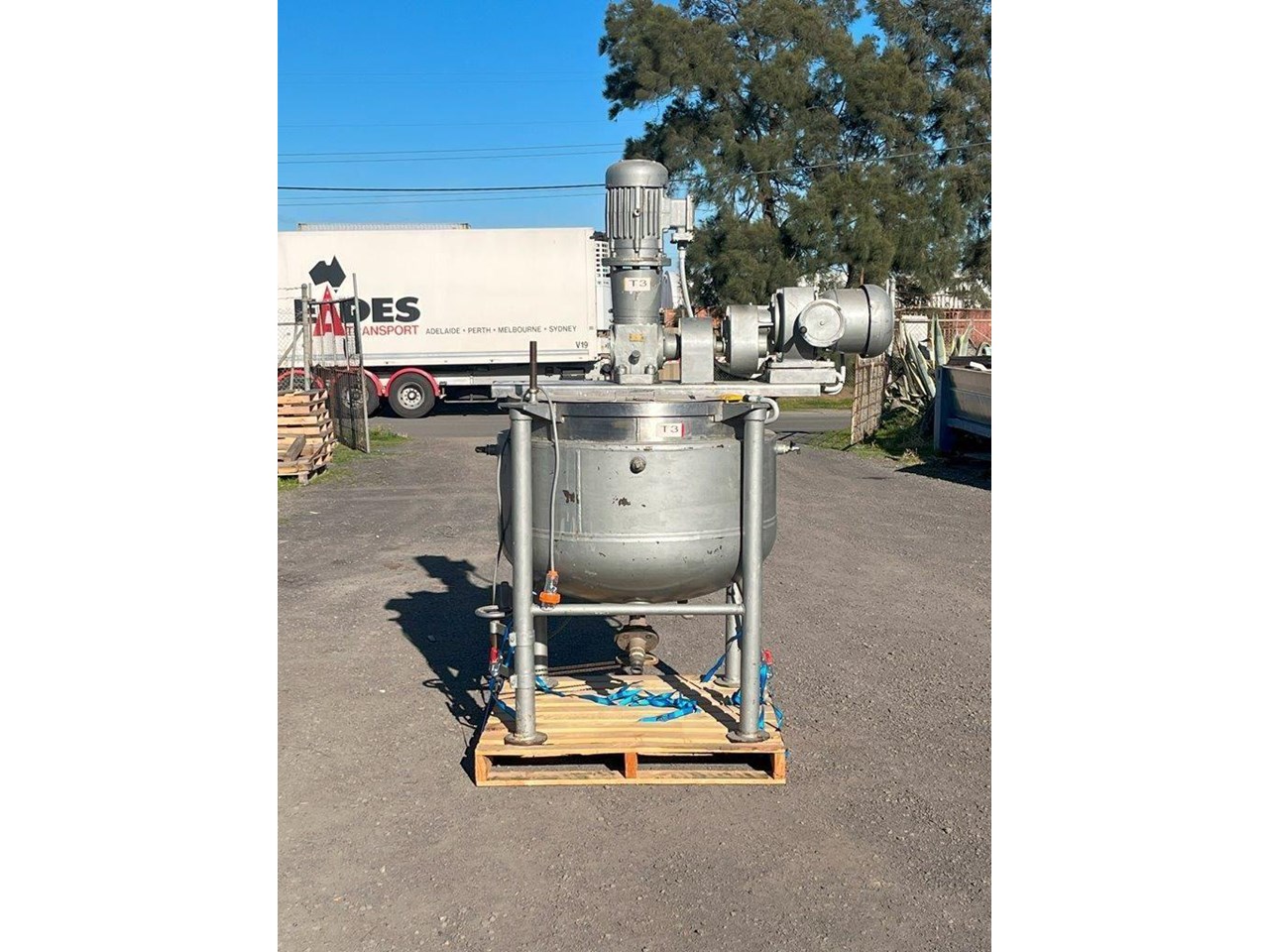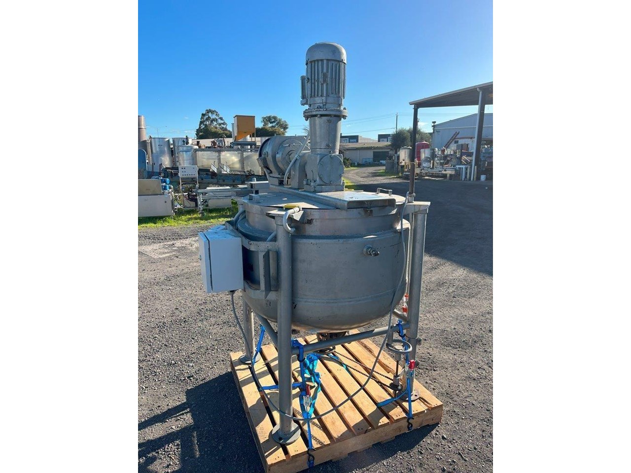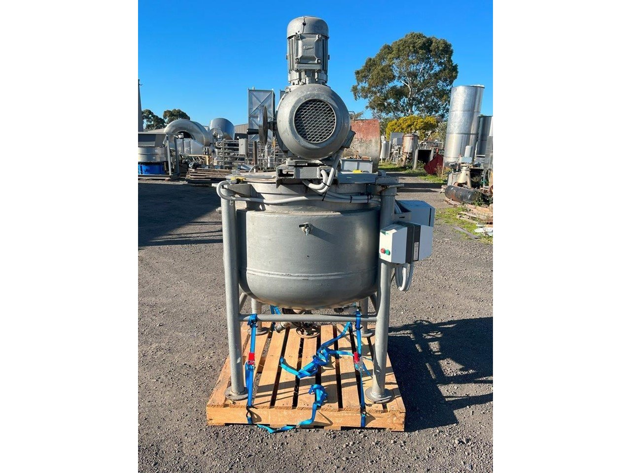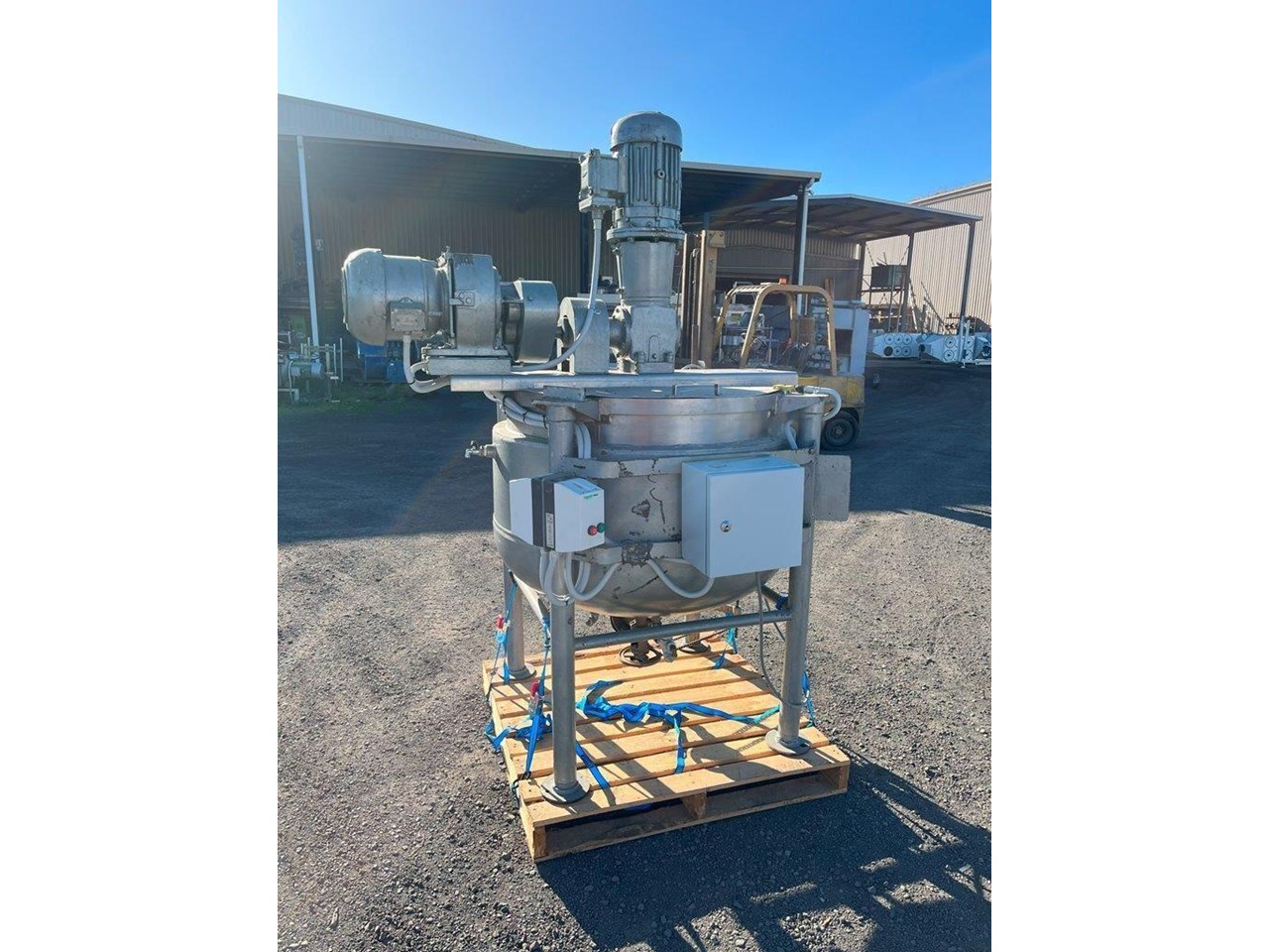 Stainless steel mixing kettle. Approximately 350 litres. 3 Phase 415V power. Contra-rotating mixing blades. Emulsifying blade. (High shear mixing head) Variable speed Hot water jacket. Manually operated discharge valve to a 1.5