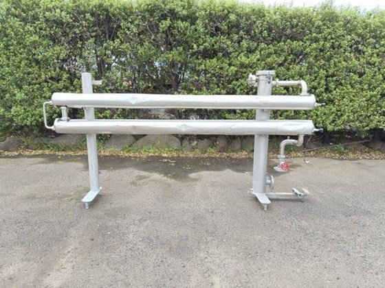 Features:-- Type - Shell & Tube Description:-- Monotube Jacketed S/S Heat exchanger. 6mt Long Internal bore 70mm. External Diameter 100m. Last used to Heat Chocolate.