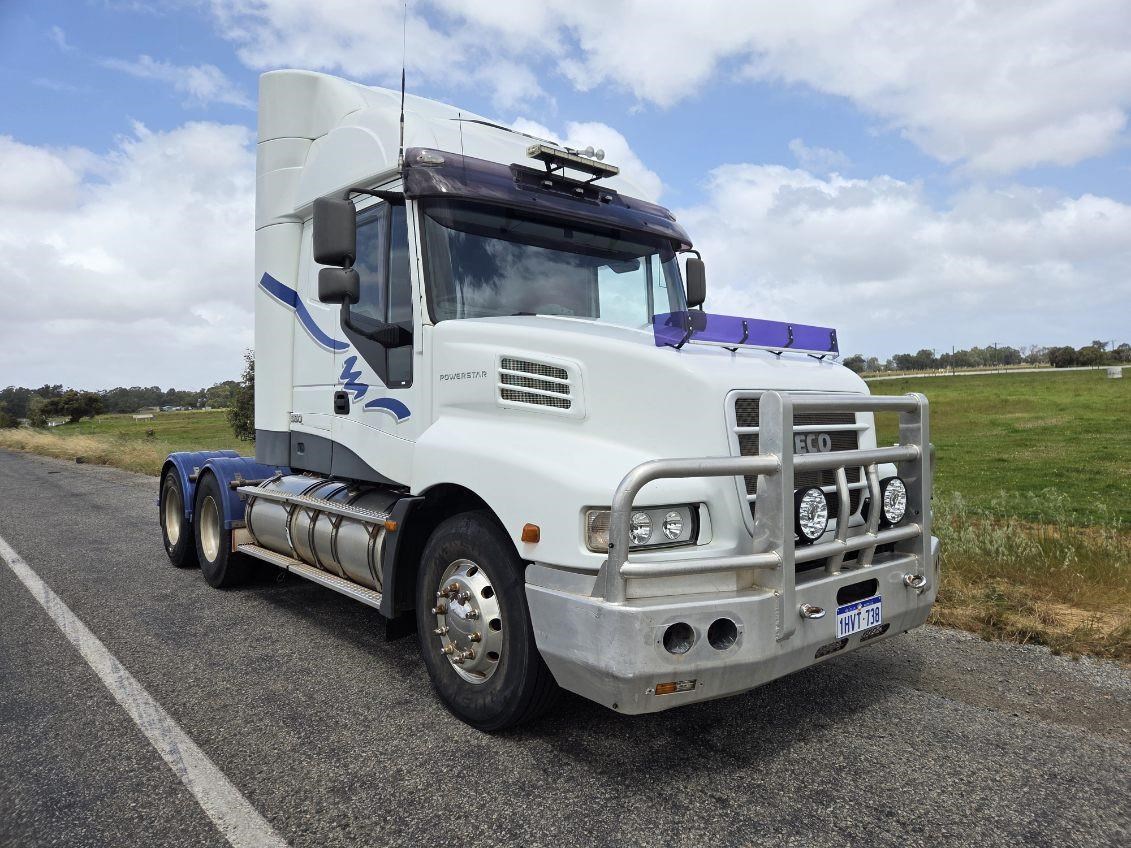 Iveco Powerstar Prime mover 90 tonne rated, 550hp Cursor engine, ZF Auto transmission, fitted with hydraulics, Refurbished 90mm Turntable, Brand new radiator installed, New Rear Shocks Replaced 12 months ago, New Beacon, Near New Tyres, This truck has been well-maintained and is mechanically sound. $55,000 plus GST. Located in Lexia WA and is available for inspection. PLEASE CALL FIRST Michael