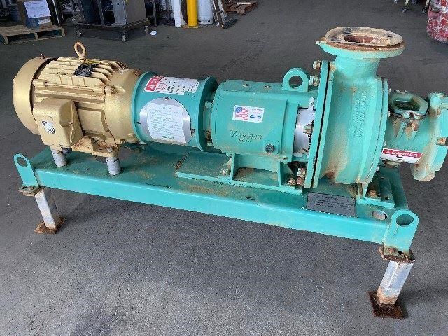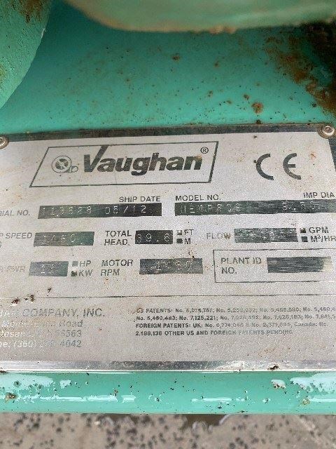The Vaughan Chopper Pump is a centrifugal pump with the unique ability of chopping all incoming solids prior to pumping. This not only protects the pump from clogging, but it also benefits downstream components, processes, and the environment. All wear components are cast steel and heat treated for maximum impact and wear resistance. These heavy-duty, patented components are engineered together to create the ultimate pump for handling severe solids. All solids are chopped as they enter between the cutter bar and the impeller vanes. The smaller solids are easily pumped by the centrifugal action of the impeller. From food processing to silt ponds, the Vaughan Chopper Pump can handle it. Connections: 6inch Inlet, 4inch Outlet. Capacity: 1800 Litres per minute at 39.6 ft Head. (100m3/hr) 11kw 1460 rpm 415v Motor. Supplied Year 2012.