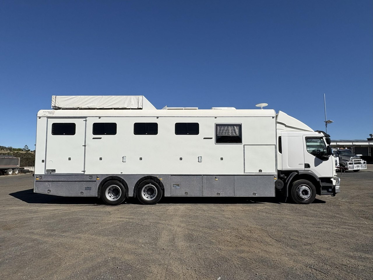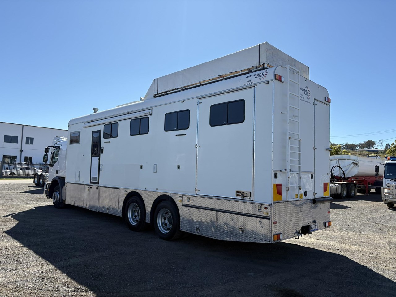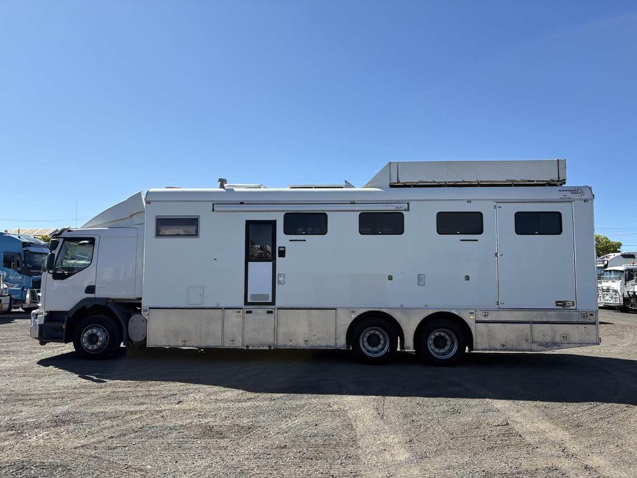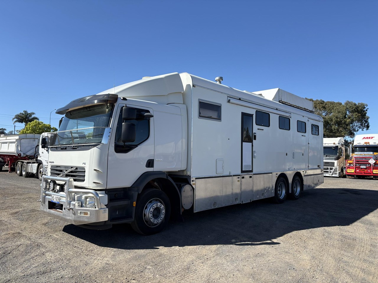 Volvo FE Horse truck with living: 2008 Compliance, Volvo D7 - 320HP Engine, 173,362kms, 12 Speed I Shift Transmission, Sleeper Cab with 2 extra seats, 8 Bag Drive Suspension, Room for 8 Horses, Side Load Ramp either side, Rear Door, Hay Rack, Diesel Generator, Pull Out BBQ, Full Kitchen, Shower, Toilet, 2x Double Beds, TV, Air Con, Ample Storage.