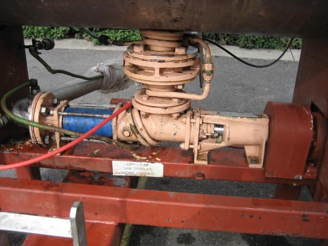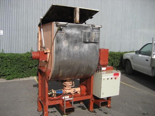 Stainless steel jacketed melting kettle or paddle blender, 600L bowl volume, hot water jacket, bottom discharge with Allweiler pump SEP50.1, internal horizontal mixer (SEW 11kw at 32rpm), air operated lid. Was last used on chocolate products.