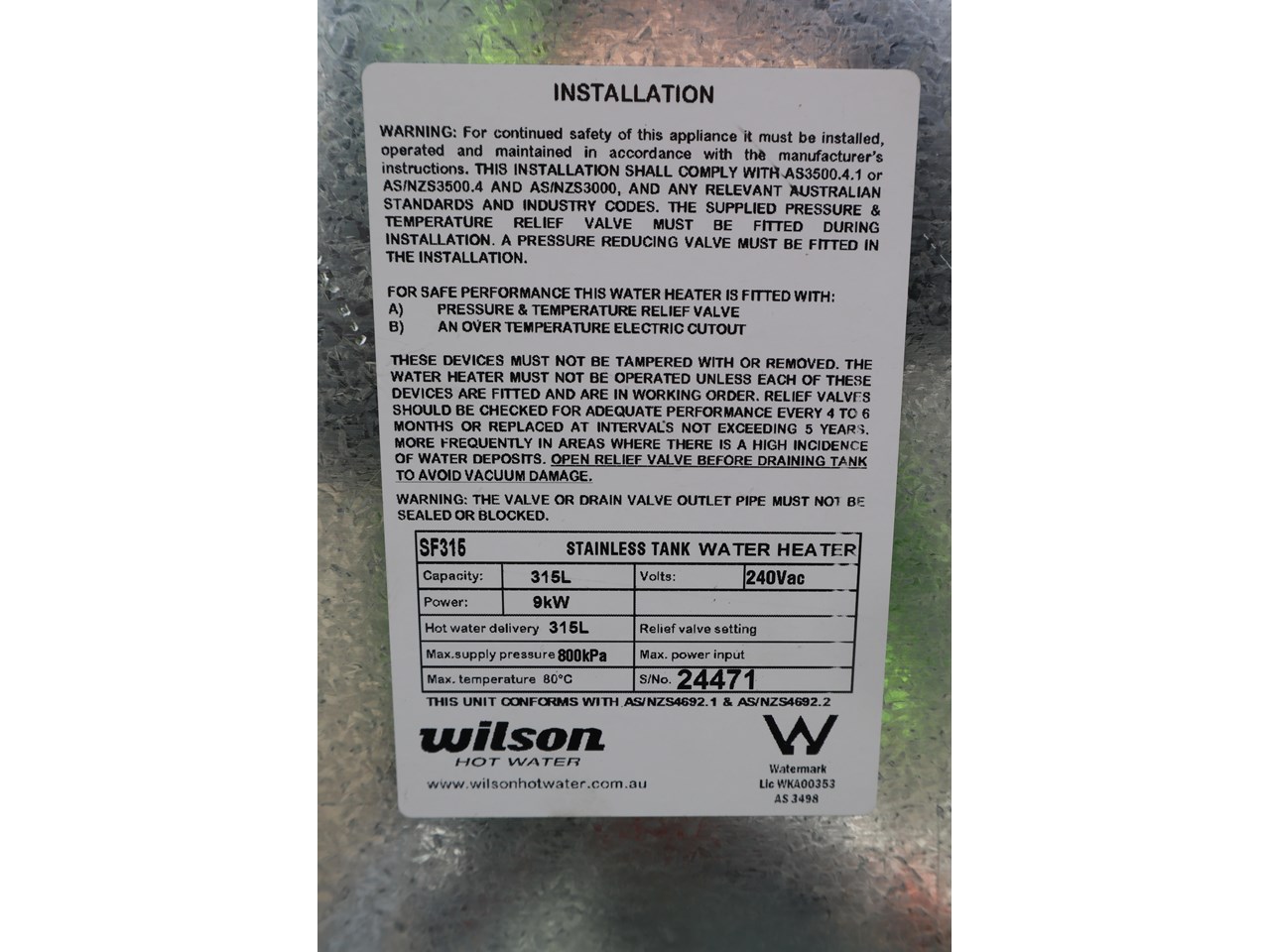 Title | WILSON SF315 ELECTRIC HOT WATER HEATER SYSTEM 315L 9KW |