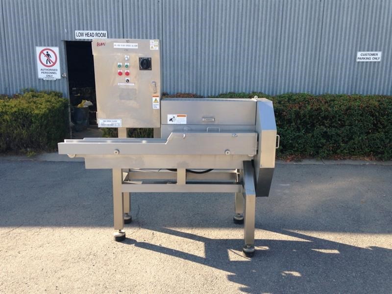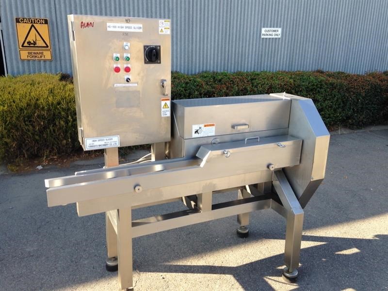 YANAGIYA HS-100 High speed slicer, last used to sliced seafood into small slices 10mm x 100m. Both slicer head and the in feed conveyor are controlled by VSD so different size slice can be achieved with the control speed. Stainless steel contact parts.
