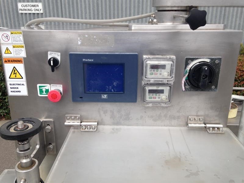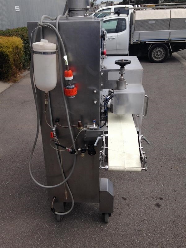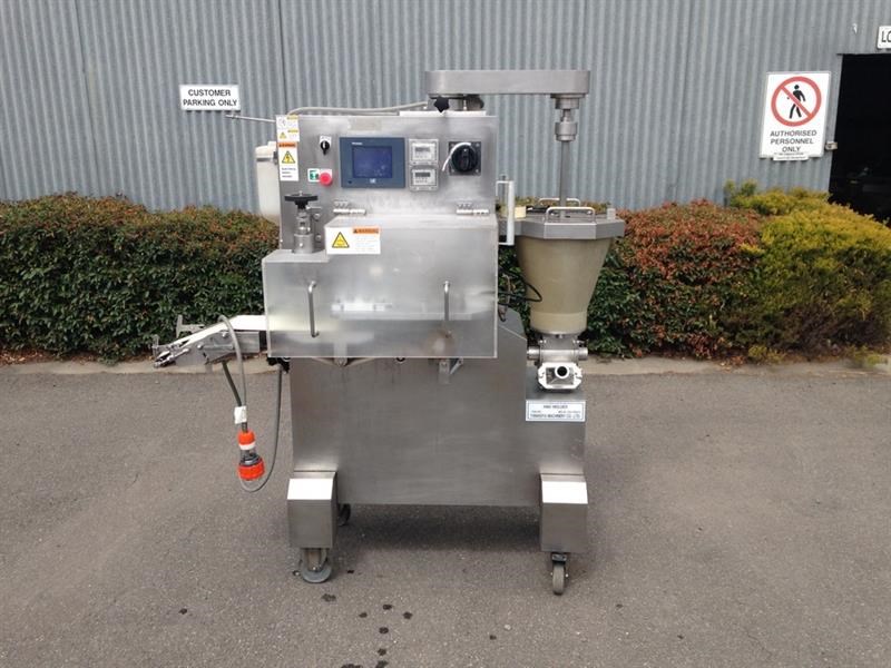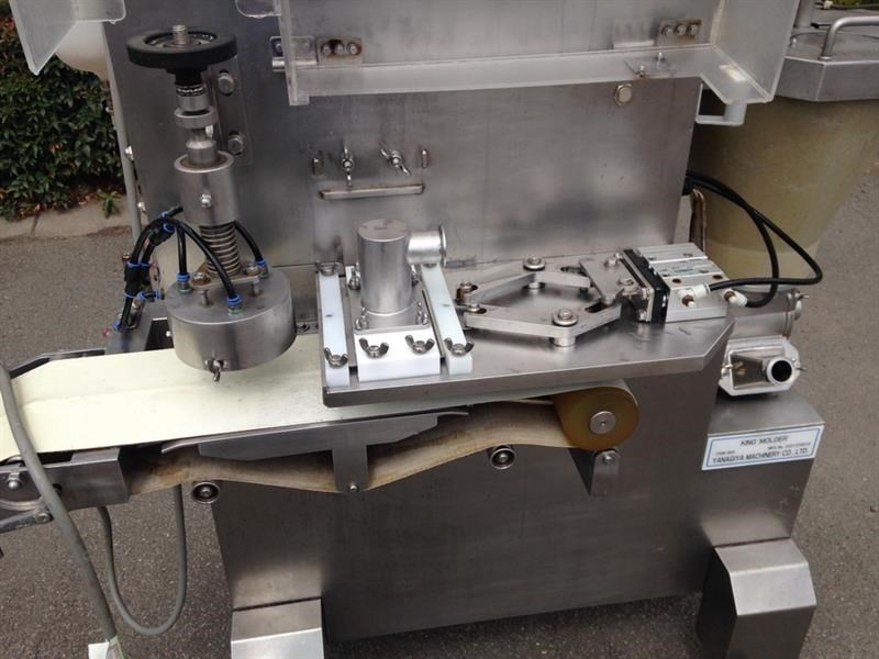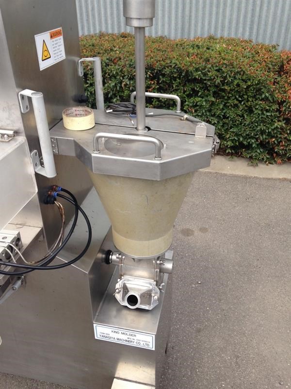 Yanagiya King moulder, last used to form meat and fish patties, Fitted with a hopper with an auger attached to keep product pressurized through the pump and into the moulder. Product can be formed into 110mm round patties with different thickness. Once product has been formed it is stamped by a shape to flatten the meat and then conveyed of to be packed. All stainless steel contact parts. Instruction manual is available on request.