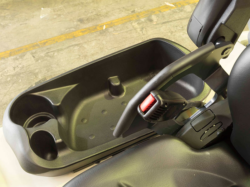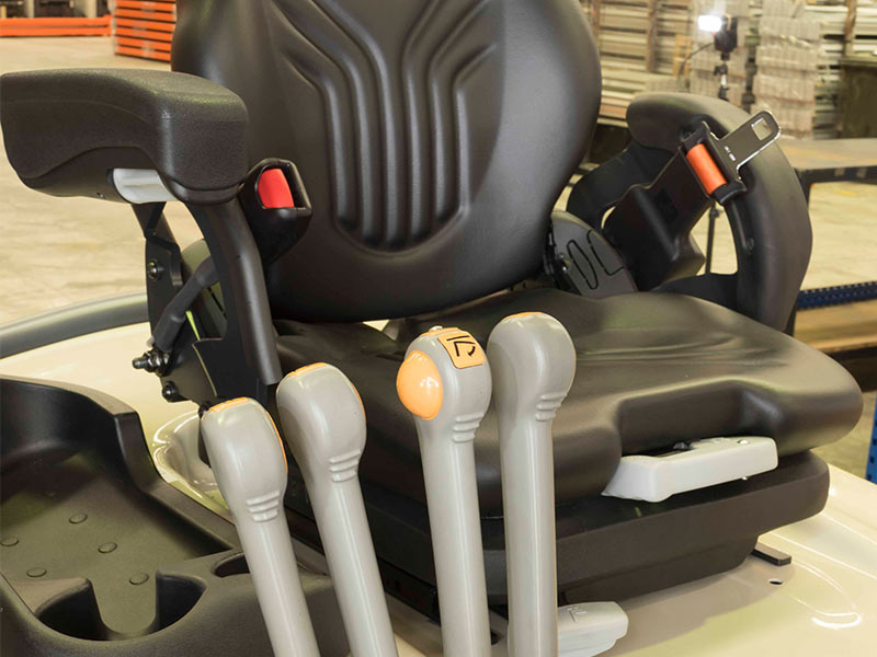 The suspension seat with adjustable lumbar support was incredibly comfortable, even for a porker like me. Once settled in I could adjust the tilt of the steering column and quickly familiarise myself with the conventional three lever controls for lift/lower, mast rake and fork tyne side shift.