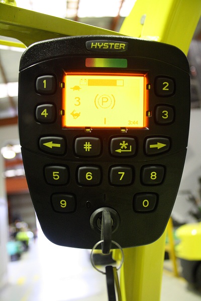 But perhaps the most striking thing about the layout of the Hyster is the abandonment of the traditional dashboard readout. Below the drivers eye level there is virtually nothing to look at, the adjustable steering column and dashboard are devoid of lights and readouts, save for a headlight switch and storage areas.