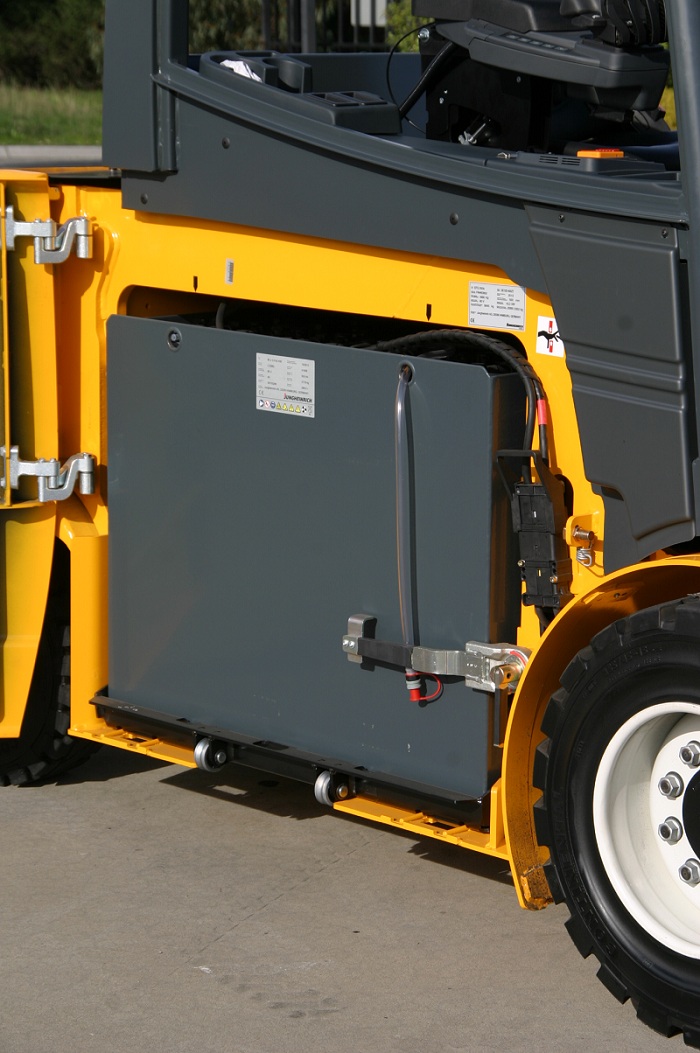 It uses SnapFit adaptors that provide a uniform battery changing system for all Jungheinrich electric counterbalance trucks, from 48V to 80V.