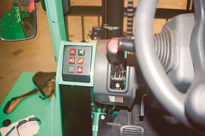 Standard are four levers in the normal position: fork raise and lower, mast tilt, fork side shift and an auxiliary control for a prong rotator with the hydraulics for this plumbed in.