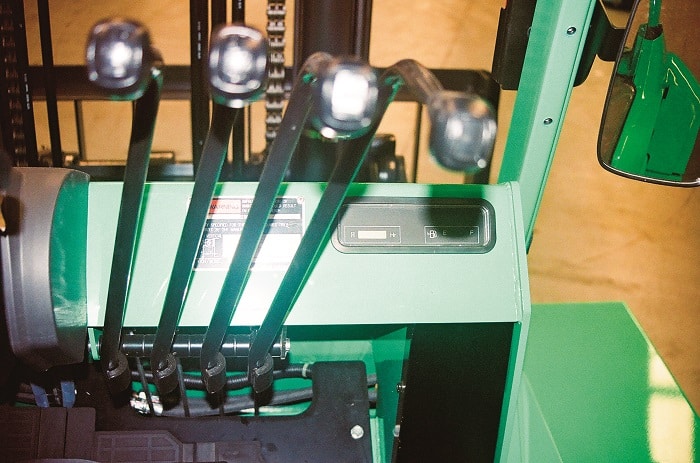 Operator safety is Mitsubishi’s number priority so the FD70N is fitted with IPS or Integrated Presence System. Catchy name, but the mast and transmission are linked to the operator’s seat.