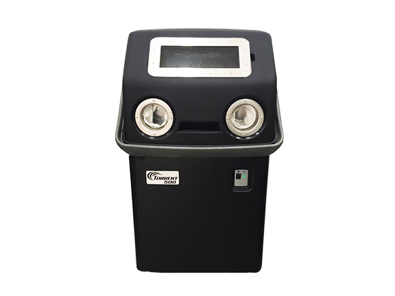 The part is placed in the enclosed unit and the user then manipulates it using integrated industrial-standard gloves to avoid direct contact and prevent mess.