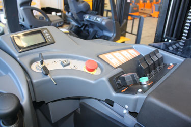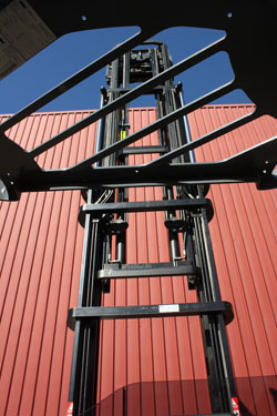 As luck would have it, I was able to take the Neos II 16 SE for a drive, both indoors and outdoors to get a feel for the machine. Climbing aboard the reach truck I was faced with a simple digital readout, and a small bank of control levers arrayed in the usual order by my right hand. In front, the steering wheel is set into the control panel, the control lever and foot pedal layout follows the same format that operators of other brands would be familiar with, and are easy to access and operate. One advantage of this truck stands out immediately, and that is the superb visibility provided by the twin hydraulic ram mast, this is standard across the range. By using two lift rams on either side of the mast, the operator can look through the mast without having his or her vision obscured. Overhead visibility is also excellent with a clear view through both the top of the cabin and the fully raised and extended mast – in this case 7.5m off the ground.