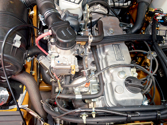 Some forklift engines resemble Gondwanaland before continental drift began — components jammed up against each other with barely room to fit a flat-head screwdriver. This one is a picture of orderly living, and clean as a whistle. Muscat points out the oil filter, and how easily it can be reached by top or bottom. Yes, by bottom. The Cat GP25N has no floor plate, meaning servicing can take place from underneath, an option sure to be a hit among mechanics. Access to the air filter is literally a breeze, and the air intake takes in air from the right-hand side of the vehicle.