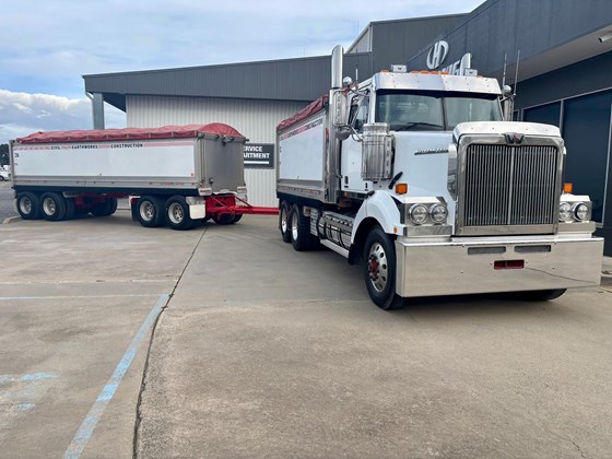 2014 WESTERN STAR 4800 TIPPER AND SHEPARD SUPER DOG, CUMMINS E5 550HP, 18SP, ROCKLINED BODIES